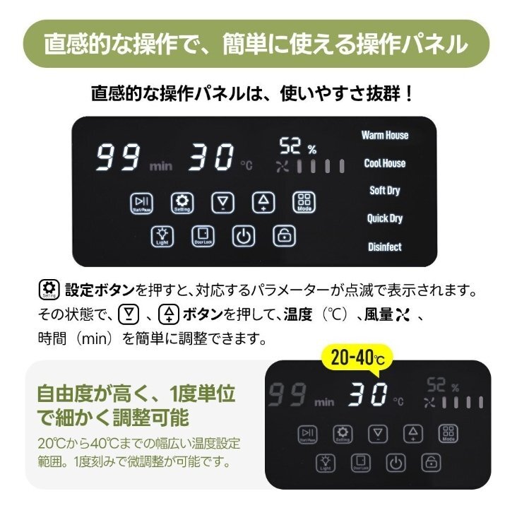 ◆02直感的な操作で、簡単に使える操作パネル 直感的な操作パネルは、使いやすさ抜群! 自由度が高く、1度単位で細かく調整可能 20℃から40℃までの幅広い温度設定範囲。1度刻みで微調整が可能で、さまざまな状況に対応します。 暖まるのも早く、寒がりな子でも安心で、オールシーズン快適にご使用いただけます。 時間調整も自在!最長で99分まで 時間は1分単位で設定可能で、最大で99分まで設定できます。ペットの毛並みやサイズにかかる時間を考慮し、ドライヤーの運転時間をカスタマイズできます。 風量も変更可能 風量は1段階から4段階まで調整可能です。 ペットの毛が厚い場合や湿度が高い場合、風量を高く設定して乾燥時間を短縮することができます。 周の環境に敏感なペットにとって、風量を低く設定することで、ペットがドライヤーの使用に徐々に慣れるのに役立ちます。