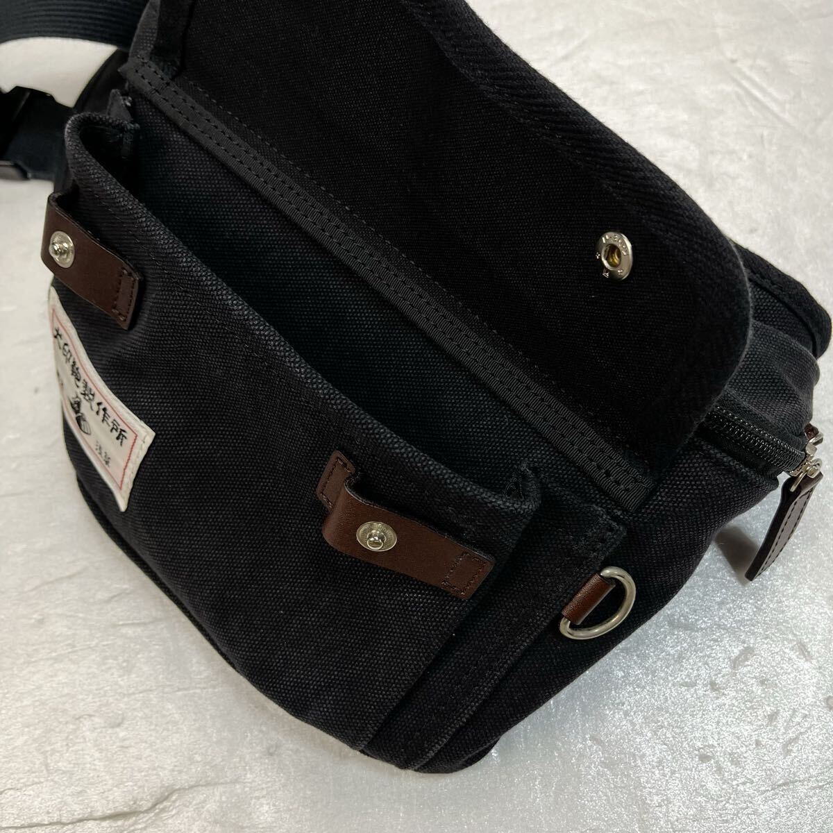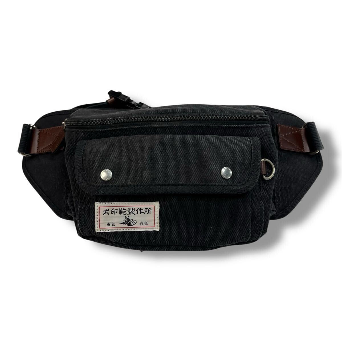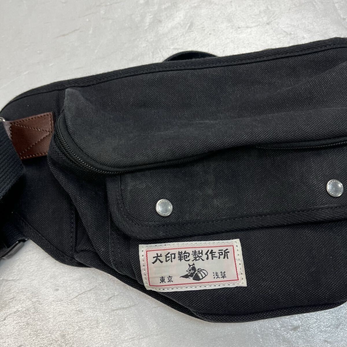 (TK1007)【希少】 犬印鞄製作所 ストーンウォッシュ帆布 ウエストバッグ ボディバッグ ブラック コットン キャンバス レザー 浅草 国産