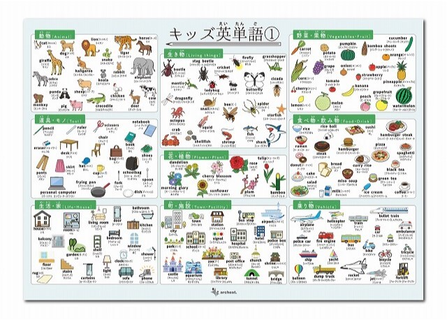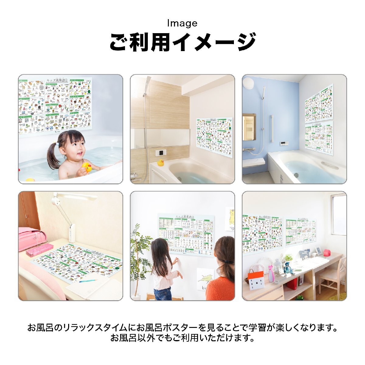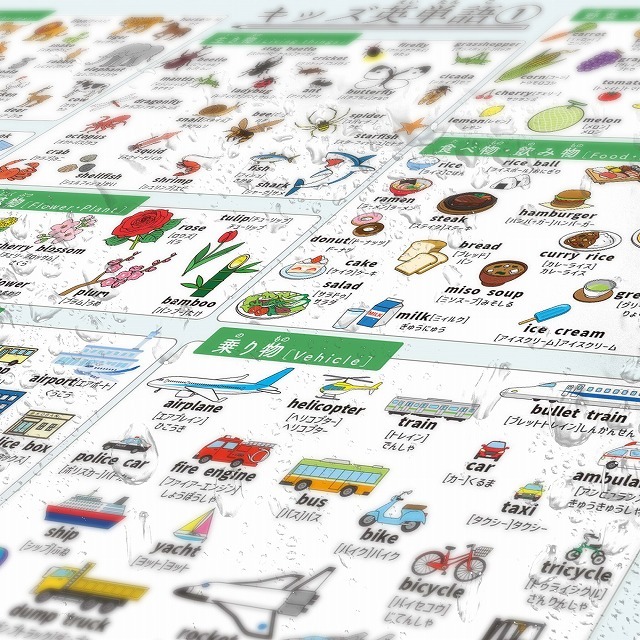 小学校からの英語学習に最適なお風呂ポスターです。基本の名詞、動詞、形容詞など450語以上を、子供たちが身近に使えるように