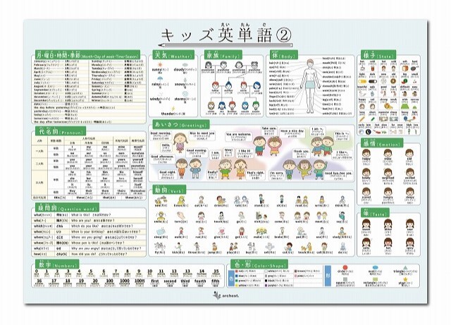 <2枚目>月・曜日・時間・季節、天気、家族、体、様子、代名詞、疑問視、あいさつ、感情、味、動詞、数字、色・形