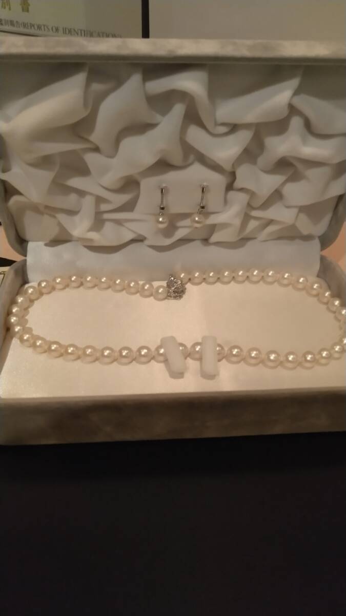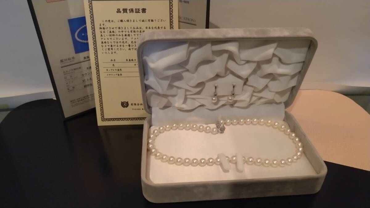 【高級本真珠のネックレスとペアジュエリー(イヤリング)の2点セット】です。