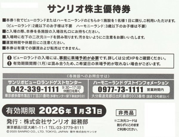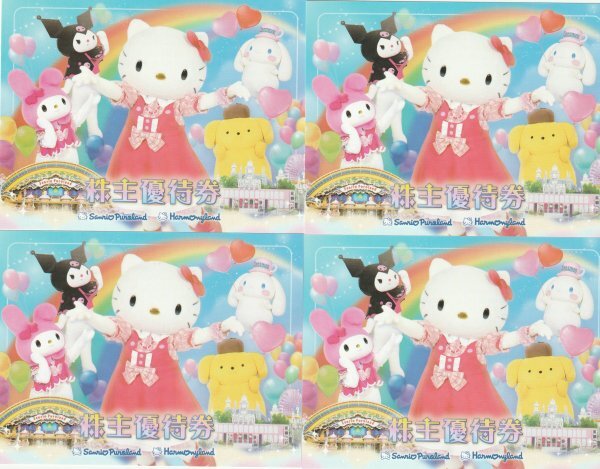 最新のサンリオ株主優待券4枚セットです サンリオピューロランドかハーモニーランドのどちらか1施設を1名様1日ご利用可能です 有効期限は2026年1月31日です 利用するにあたっての留意点をご理解した上で入札願います | |||