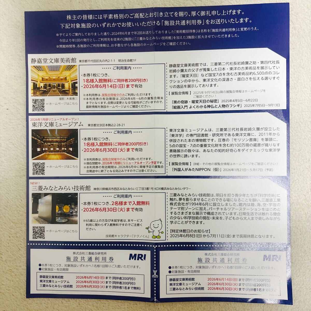 静嘉堂文庫美術館 三菱みなとみらい技術館 東洋文庫ミュージアム の施設共通利用券です。
