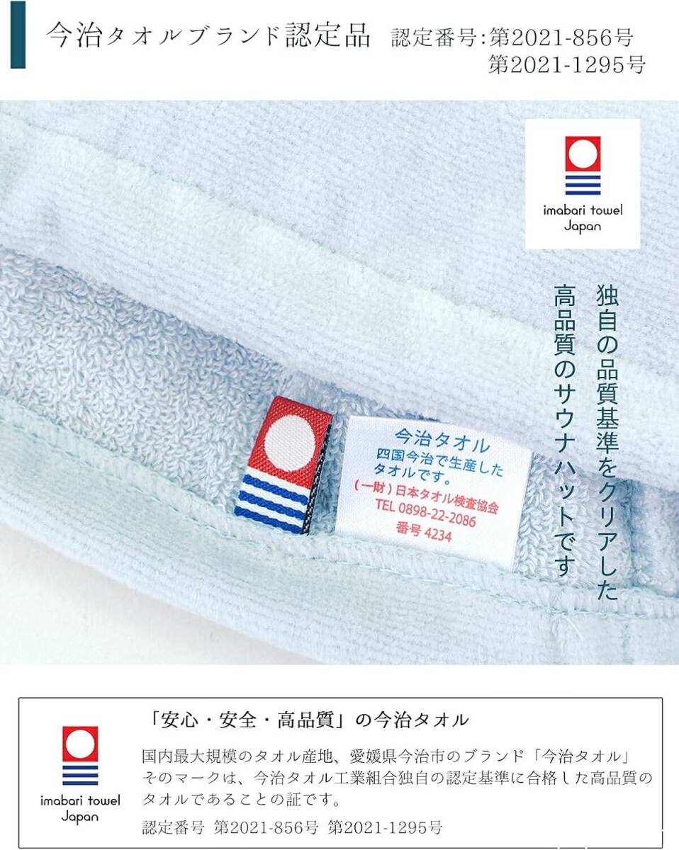 この商品は、今治タオル工業組合独自の品質基準に合格した高品質の「今治タオルブランド」ロゴ入りのサウナハットです。 抗菌・防臭・抗ウイルス加工済商品。