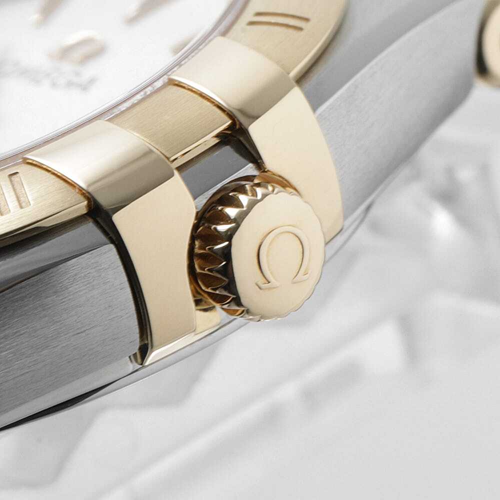 モデル情報 | オメガを代表する最もオーソドックスでドレッシーなデザインの“コンステレーション”。ケースに施された有名なハーフムーンデザインと爪、リンクブレスレットが特徴です。こちらはステンレスとイエローゴールドに、ローマ数字が刻印されたベゼルが印象的なモデル。針やロゴ、コンステレーションの星にもイエローゴールドを使用、ケースバックにはコンステレーションを象徴する天文台のメダリオンが施され、シンプルながらラグジュアリーな雰囲気が漂います。 |