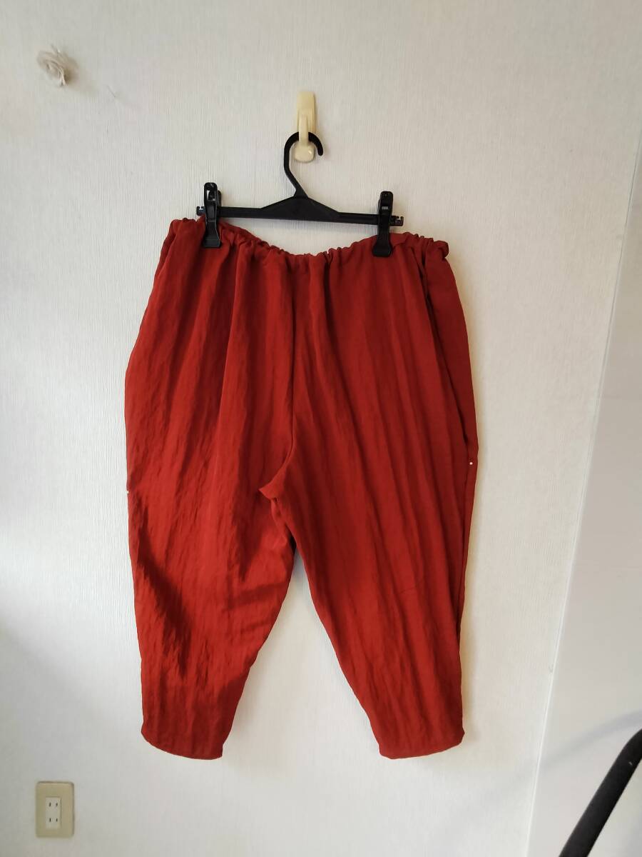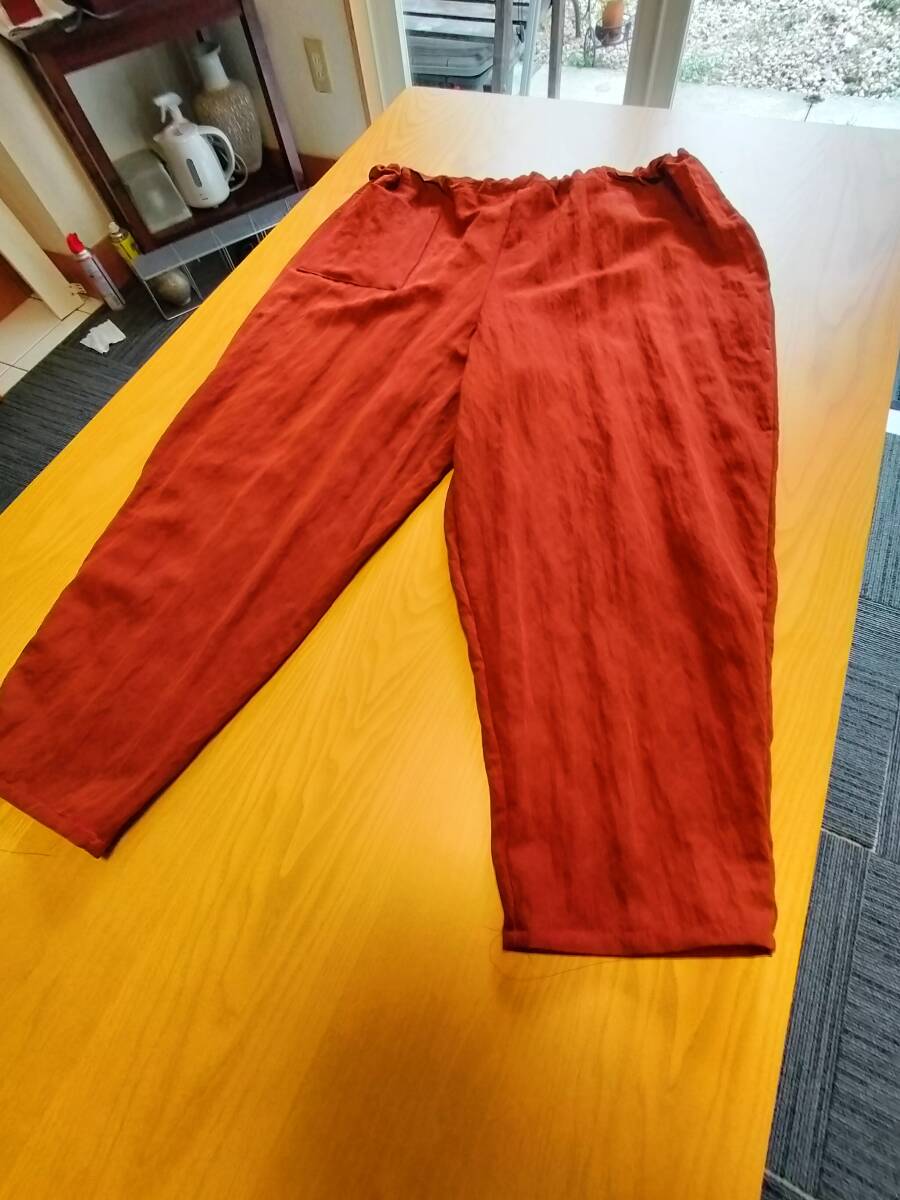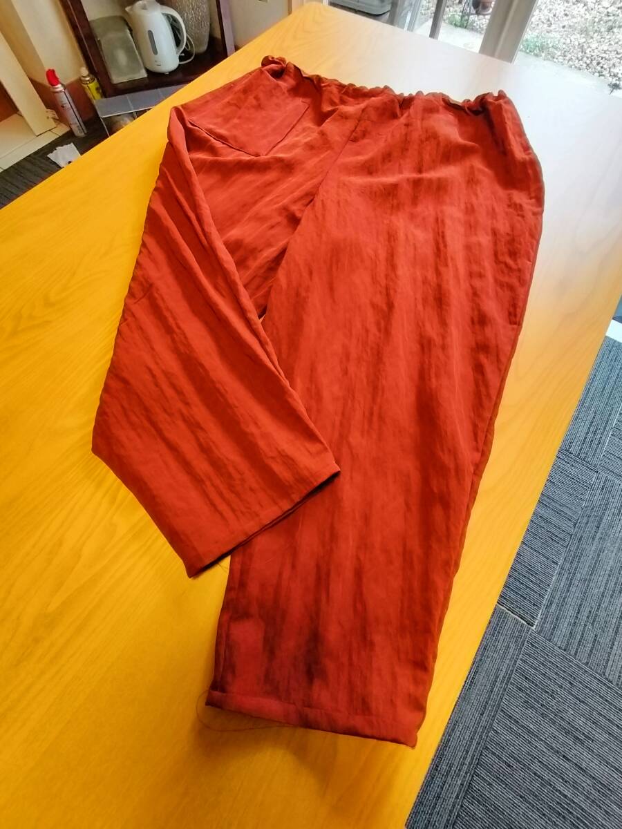 ポリエステルとナイロン混 サラッとして落ち感の良い生地 オレンジにブラウンを混ぜた落ち着いた上品な色合い    お腹、ヒップ回りがふっくらで可愛い こんなパンツが有ったらいいなと思い 4年ほど前から製作しています。 私のお腹とヒップはどこ?のはき心地 短い丈のトップスやTシャツと合わせてくださいね 着用時のラインがスッキリ綺麗  自分がはきやすく、ゆったりスッキリのパンツを作ってみました
