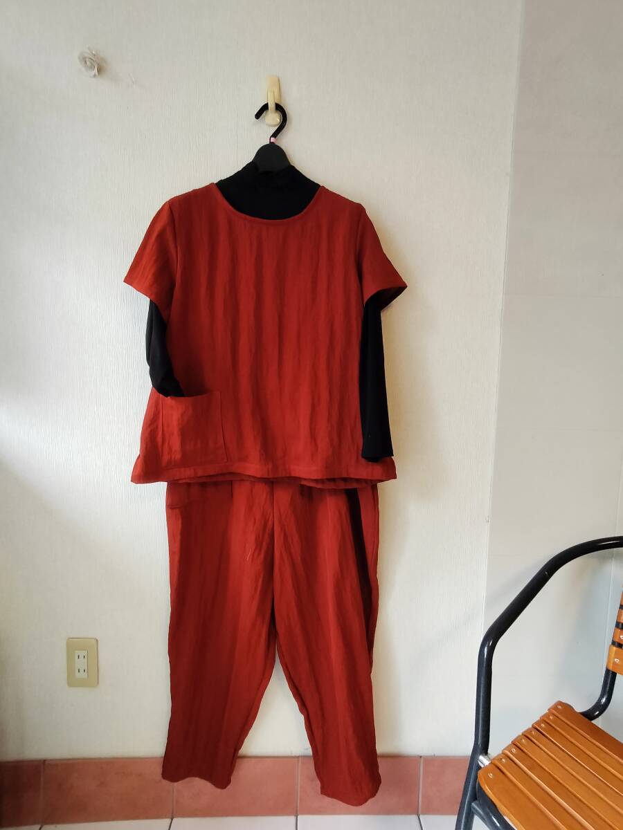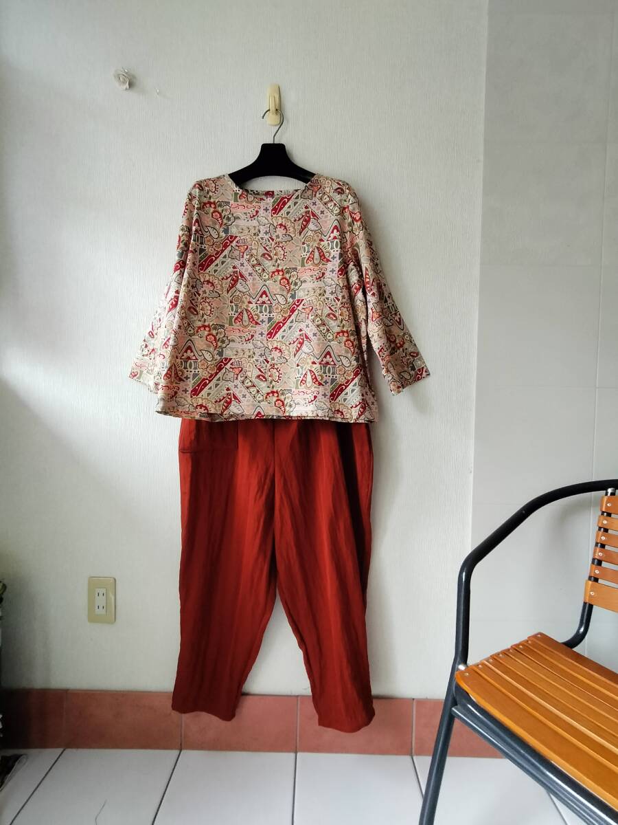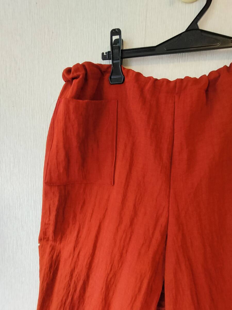 ポリエステルとナイロン混 サラッとして落ち感の良い生地 オレンジにブラウンを混ぜた落ち着いた上品な色合い    お腹、ヒップ回りがふっくらで可愛い こんなパンツが有ったらいいなと思い 4年ほど前から製作しています。 私のお腹とヒップはどこ?のはき心地 短い丈のトップスやTシャツと合わせてくださいね 着用時のラインがスッキリ綺麗  自分がはきやすく、ゆったりスッキリのパンツを作ってみました