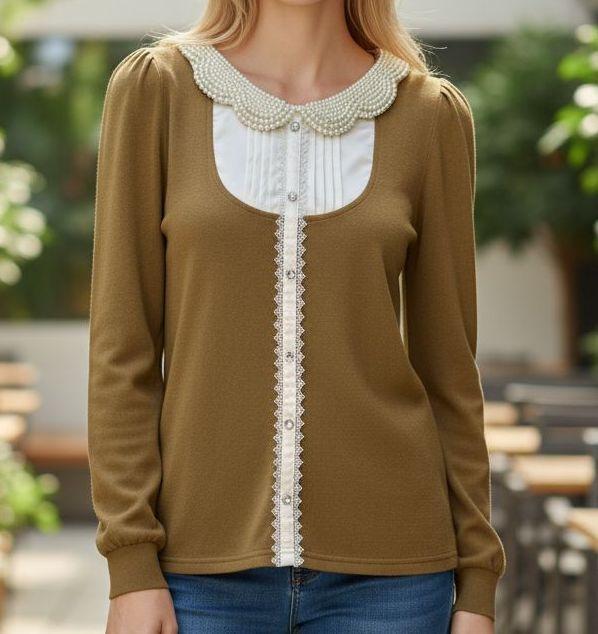 暖かみのある茶系の色味に、パール装飾の襟が華やかさを添えます。