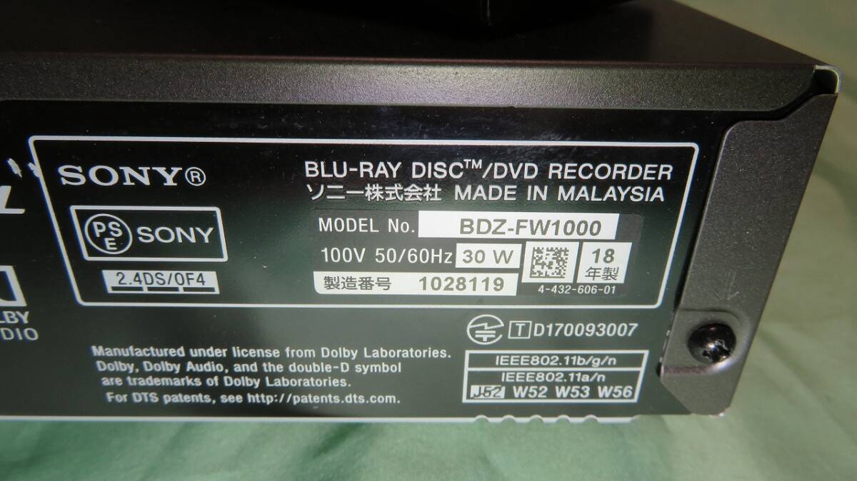 【twj08-8119】 送料込★SONY BDZ-FW1000 HDD 1TB 新同品交換済/ 2番組同時録画 無線LAN内蔵/ 純正リモコン付/ 動作OK! BDレコーダー★