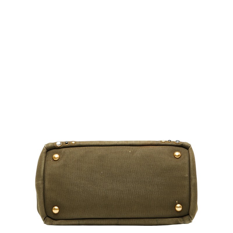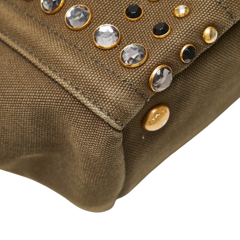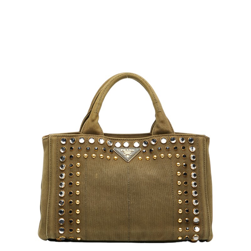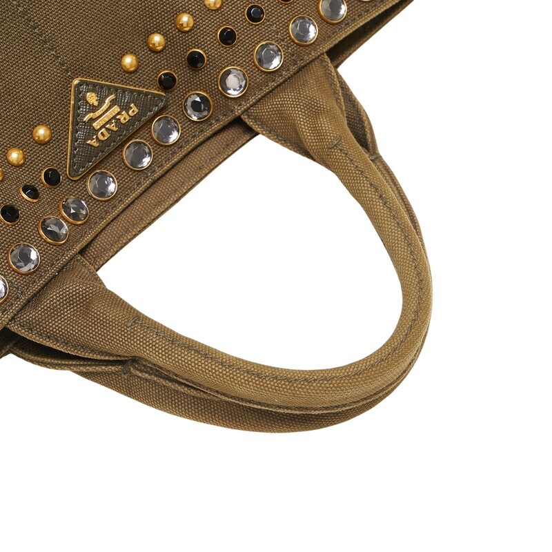 プラダ 三角ロゴプレート カナパ ビジュー スタッズ ハンドバッグ カーキグリーン キャンバス レディース PRADA 【中古】