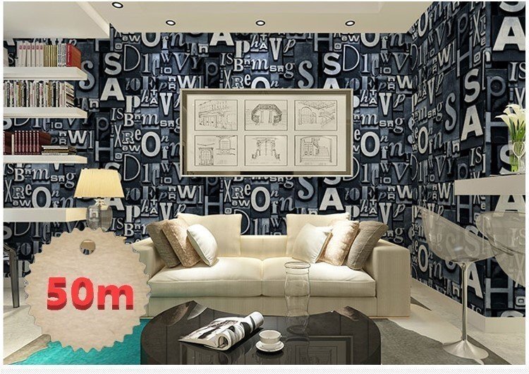 3D ウォールペーパー 【ビンテージロゴ×藍色】 英字 53cm×50m アンティーク DIY のりなし 壁紙 クロス リメイク 欧米