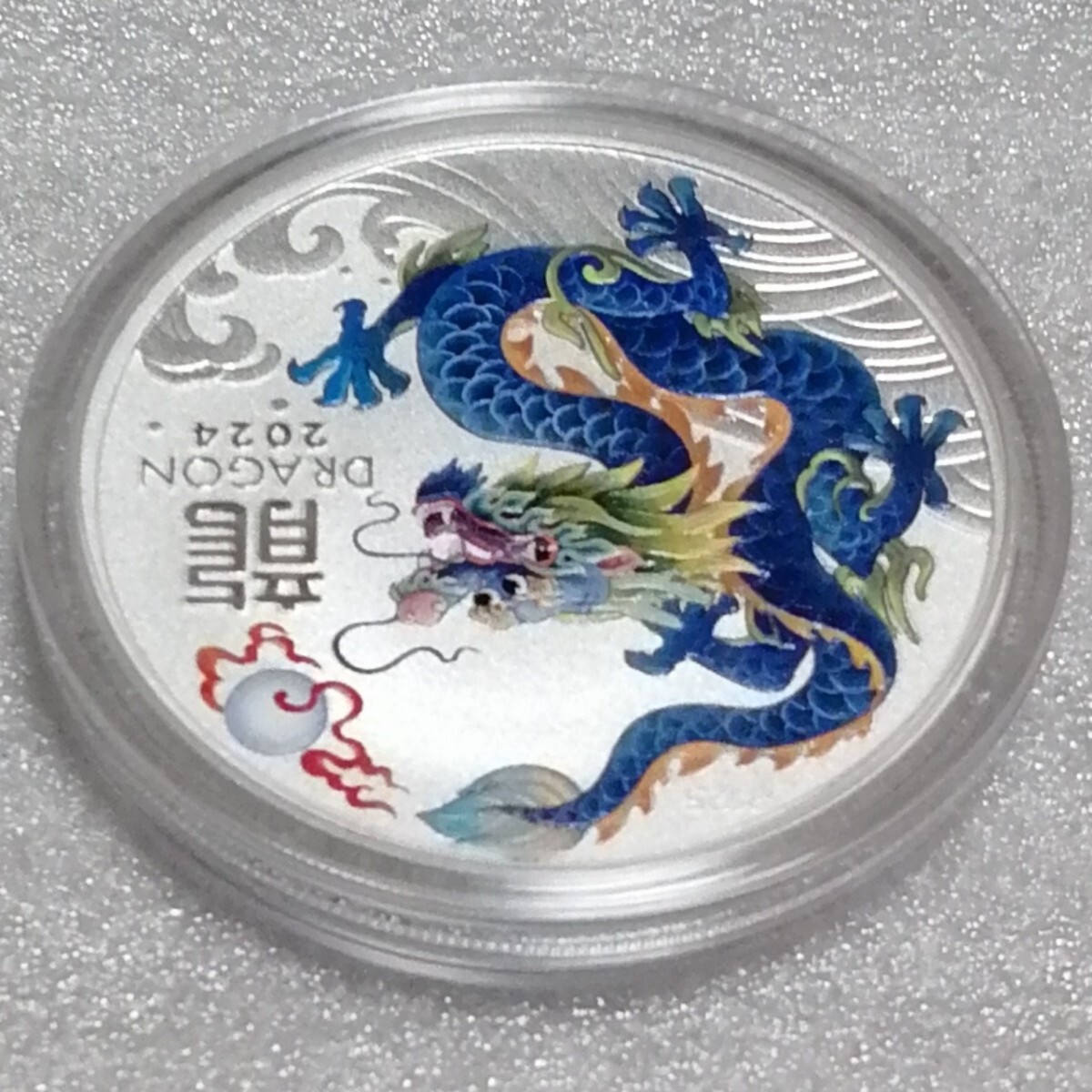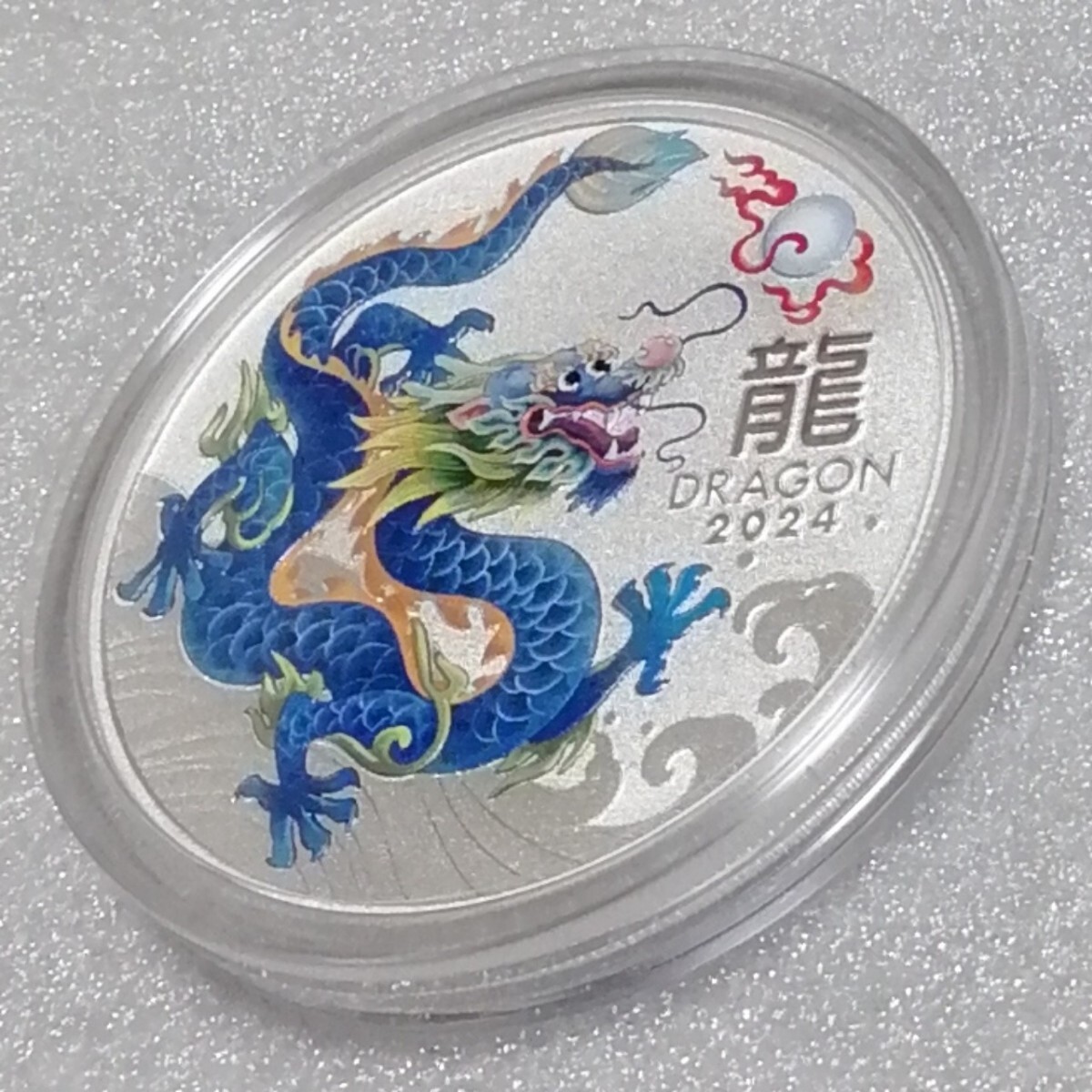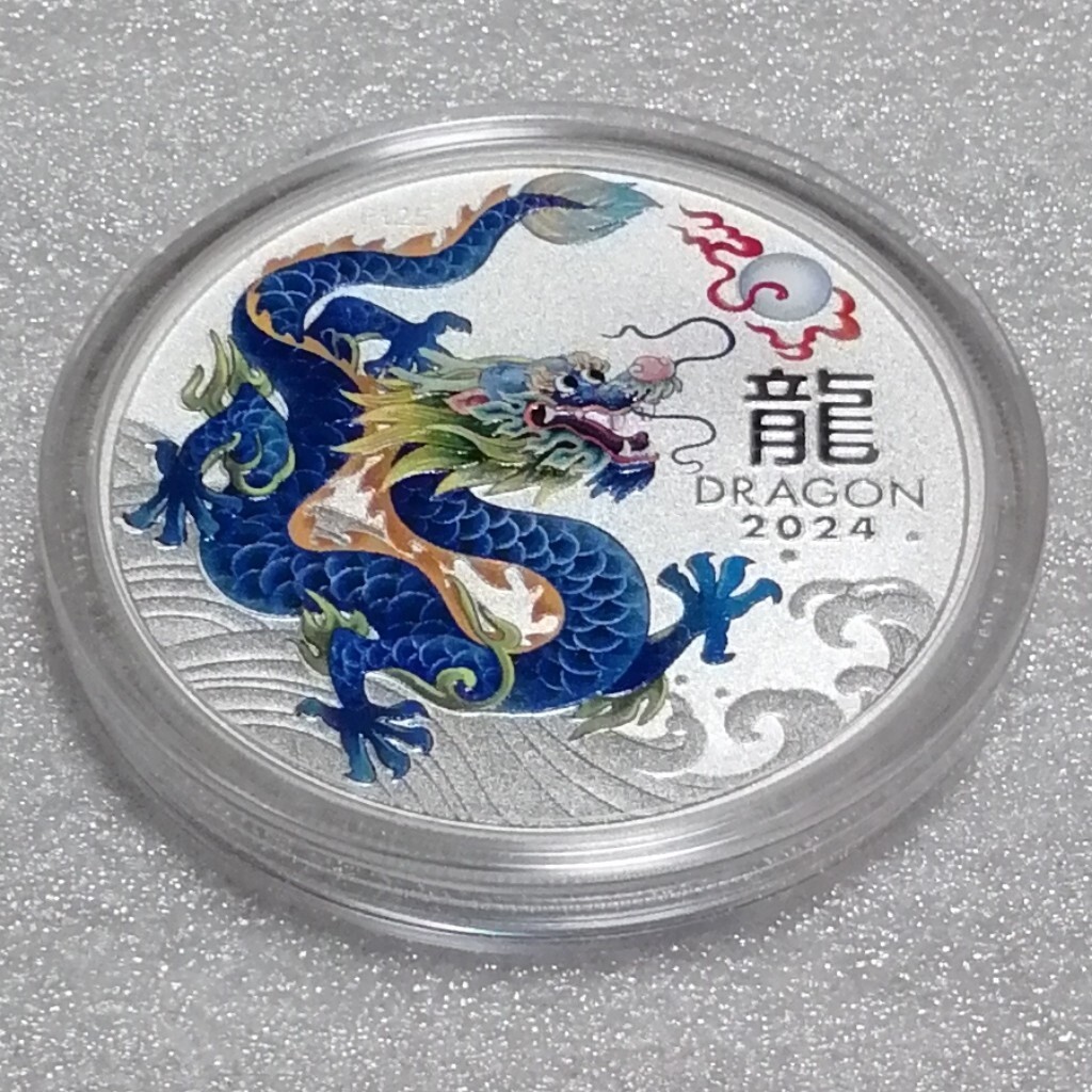 重量1トロイオンス(31.107g)。直径40.9ミリ。厚さ3.5ミリ。純度.9999。発行枚数200000。ティールドラゴン。オリジナルカプセル(ミントカプセル)付き(一度も開けてません)。オーストラリアの造幣局パースミント発行。