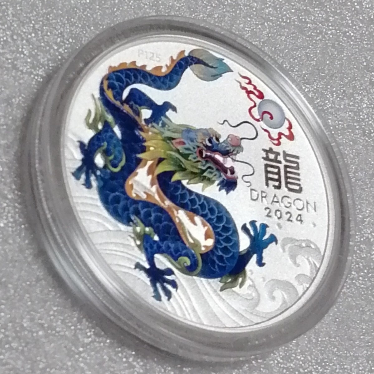 コインには中国のドラゴンが描かれ、縁にはパース造幣局設立125周年を示すP125のミントマークが刻まれています(5番目の画像参照)。