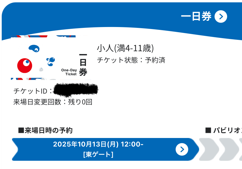 EXPO2025 大阪関西万博 入場チケット 10月13日(月) 東ゲート12:00 入場予約済み 小人1枚