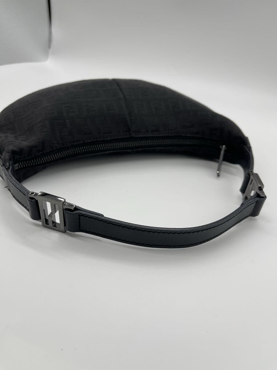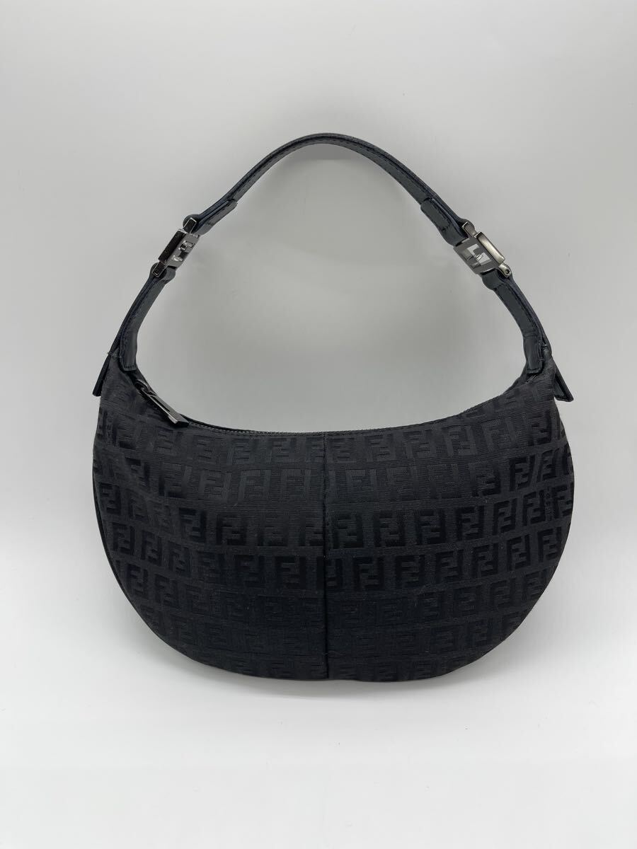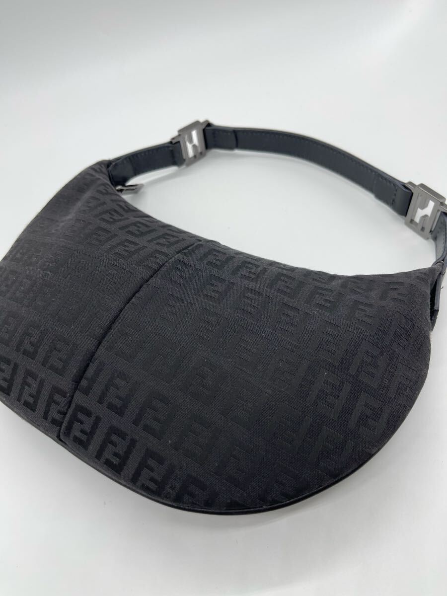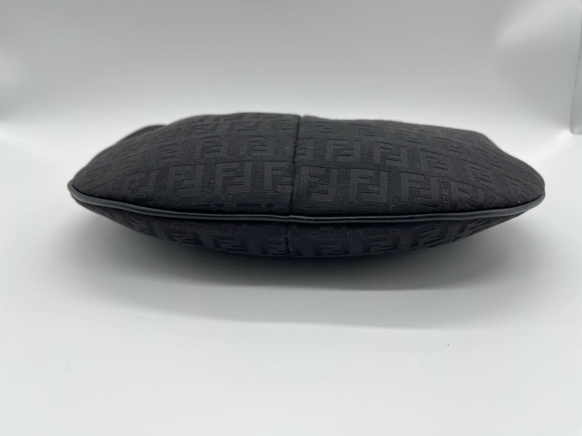This is an authentic FENDI Zucca pattern hobo bag in elegant black, featuring the iconic double “F” monogram fabric.