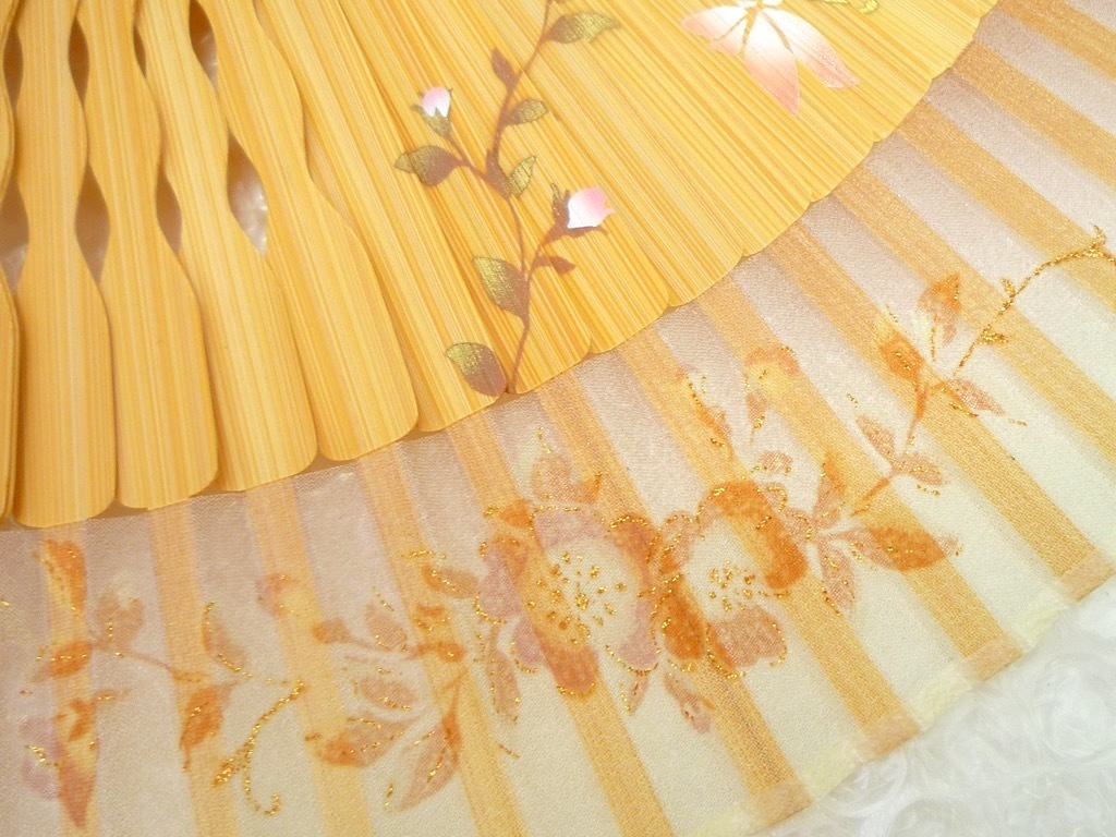 ●扇面の野ばらのシルクプリントには、ところどころグリッターが効いてキラキラ輝く