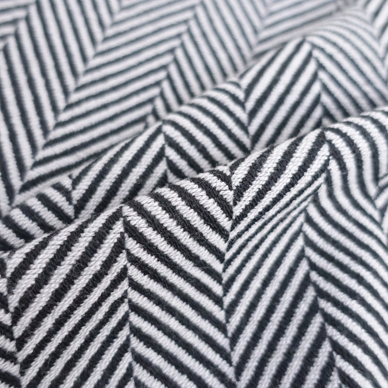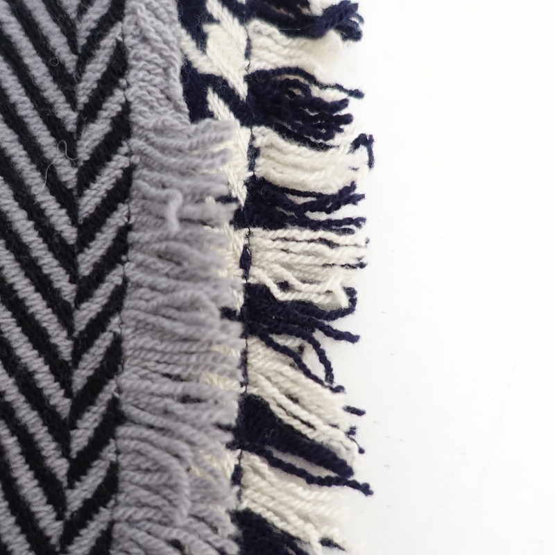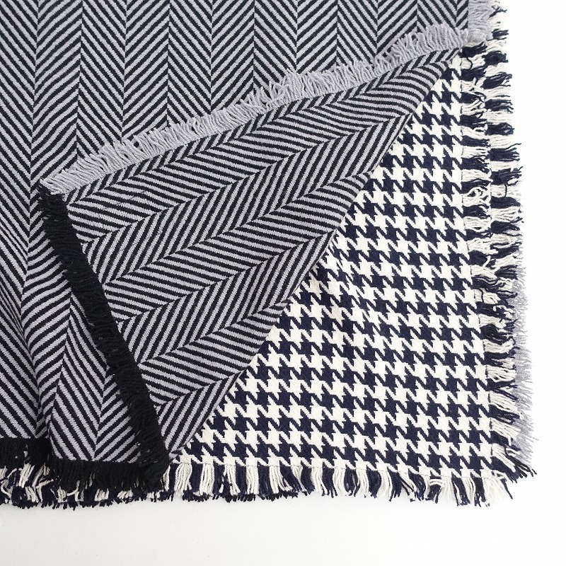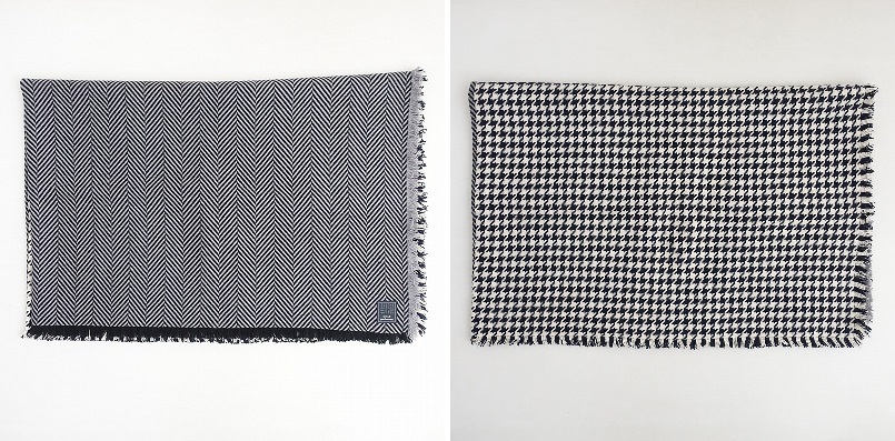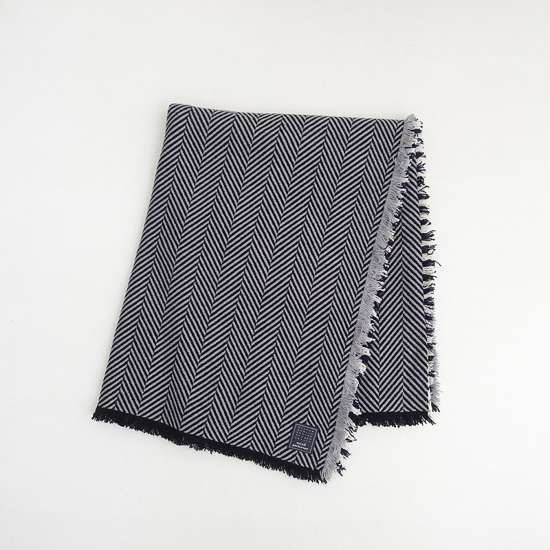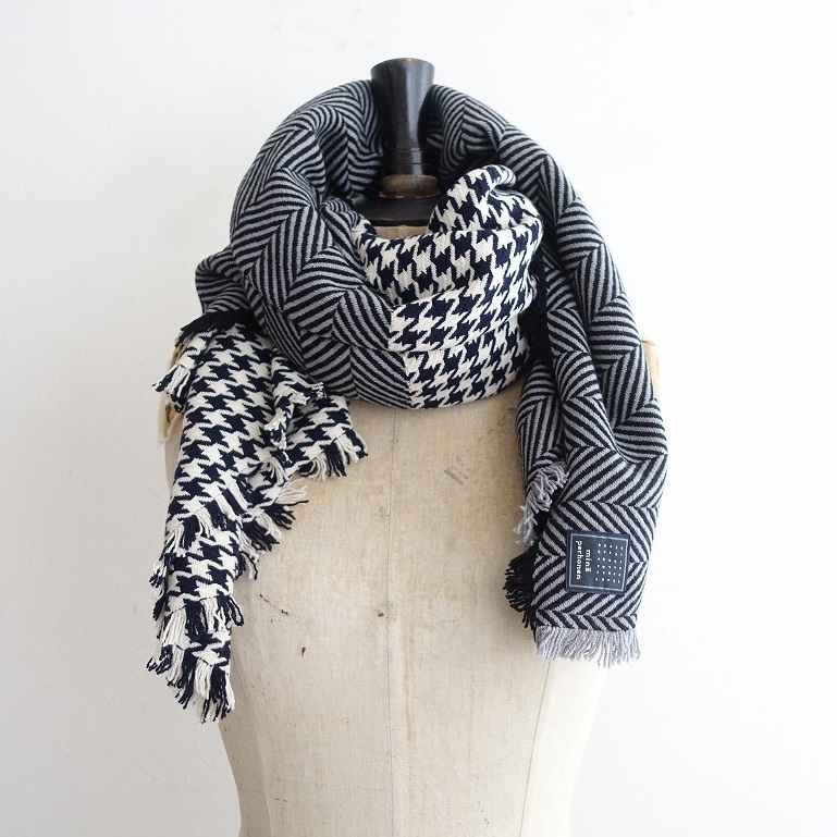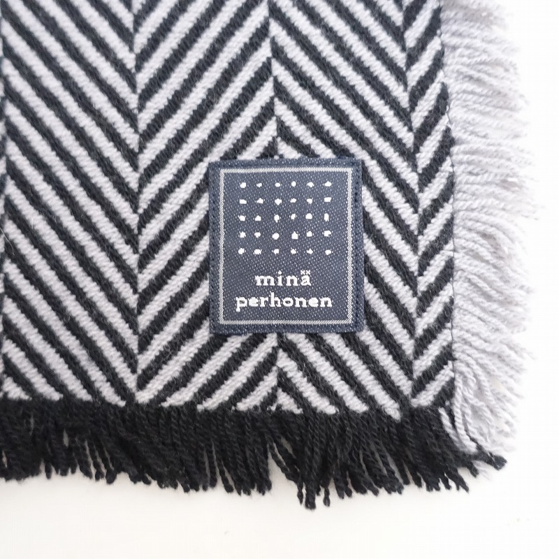 mina perhonenのsurf 大判ストールです。カラーはグレー×ブラックのヘリンボーン織、ダークネイビー×アイボリーの千鳥格子織の切り替えです。ウール100%の柔らかな素材で、布端はフリンジ仕様、定価(メーカー希望小売価格)19,800円の商品です。 |