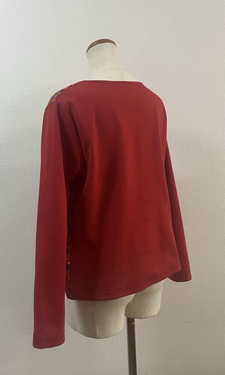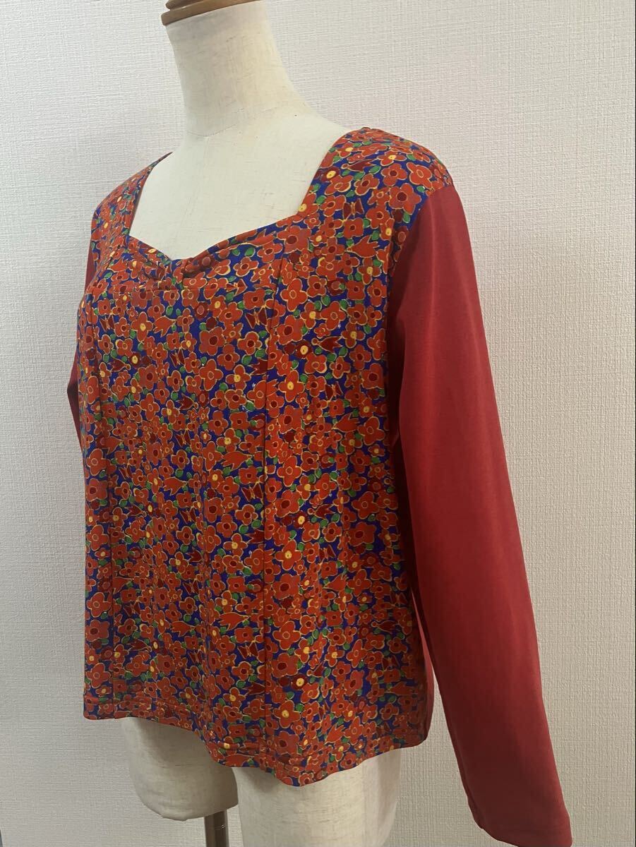 お色は落ち着いたら赤系無地、赤、青、緑、銀ラメ系の花柄によく見ると蝶や鳥が舞う可愛い柄の切替です。前リボンのスクエアデザインで痩せ効果大!ワイドパンツやスカート等と合わせやすい丈感で、肌触りも良く着やすいサイズ感もおすすめです。透け感なし伸縮性あり