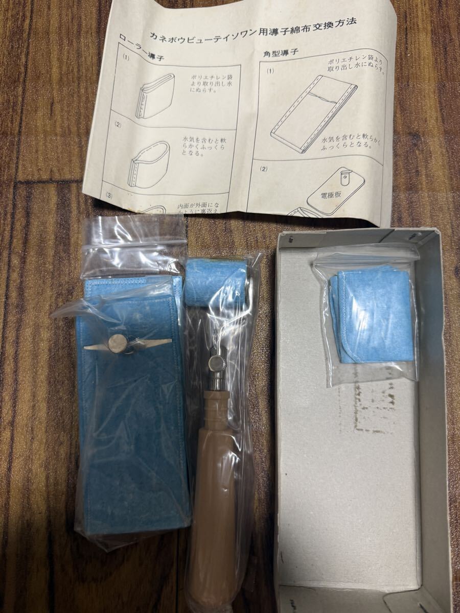 【商品の状態】カネボウ ビューティソワンエステティック機器の付属品導子綿布の交換方法が書かれた説明書と、ローラー導子、角型導子などの部品