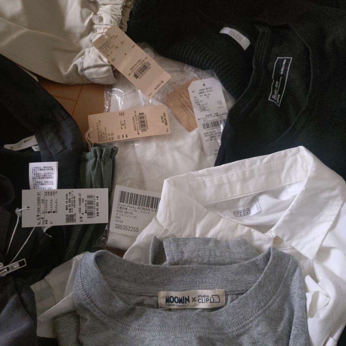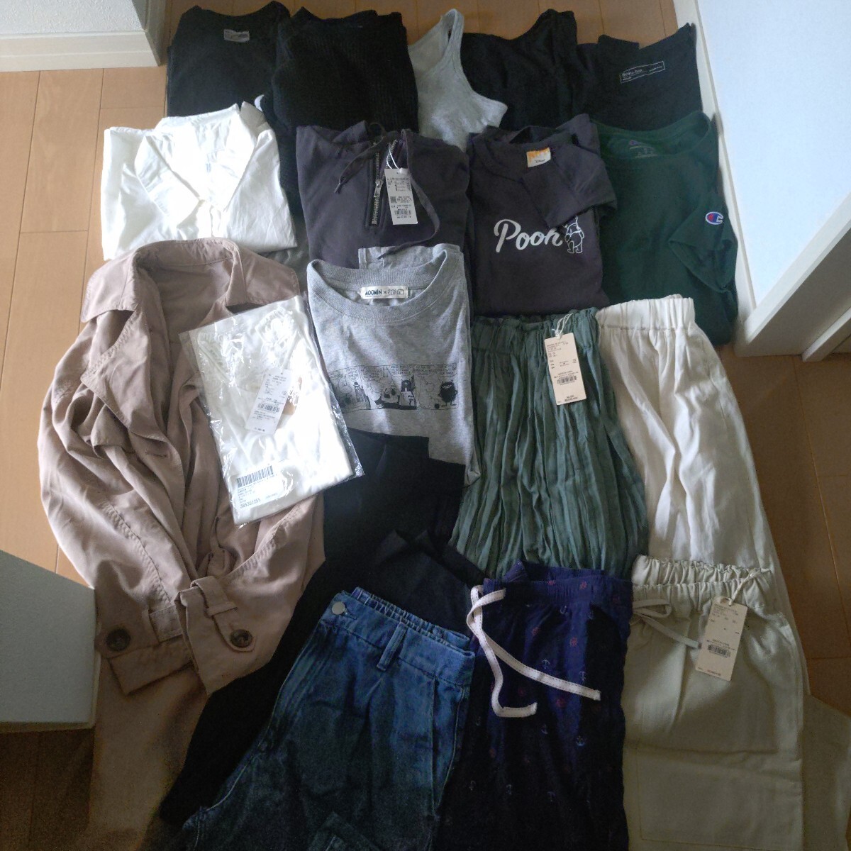 手持ちのお洋服まとめて出品します。写真の物すべてです。М〜Lサイズくらいの方に。アンドエスティが大好きでついつい買いすぎちゃうので、そのブランドが多いです。新品タグ付きから、結構使用しましたがまだまだ着られるよ!というものまで様々です。インナー、半袖Tシャツ、ロンT、シャツ、スカート、ボトム、トレンチコート、などなど。不要なものは処分、転売お好きにどうぞ。お安く出品しますので、細かな点気になる方はご遠慮ください。詳細は写真でご確認ください。