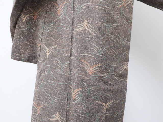 リサイクル商品のため、胴裏に糸つれがございますがご着用いただけると存じます。 地色は、こげ茶色です。 1枚目の画像が近いお色かと思われます。 素材は正絹です。 |