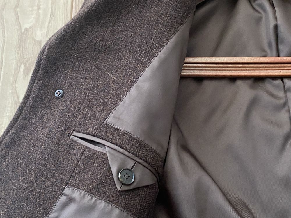 上襟に高さがあり上品な雰囲気にもツイードの素材感を活かしたラフなコーディネイトにも合う幅広く使える一枚です。