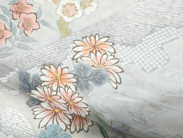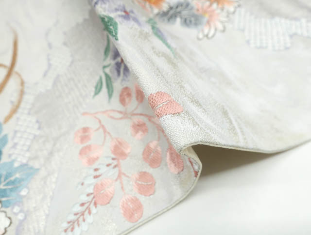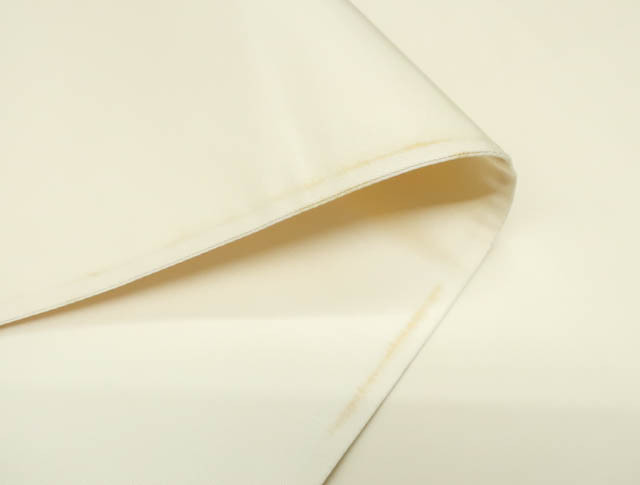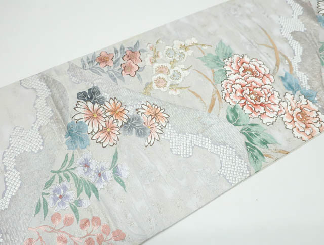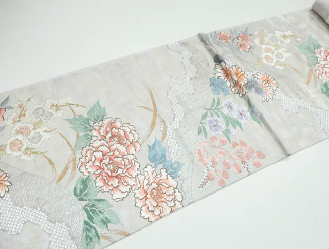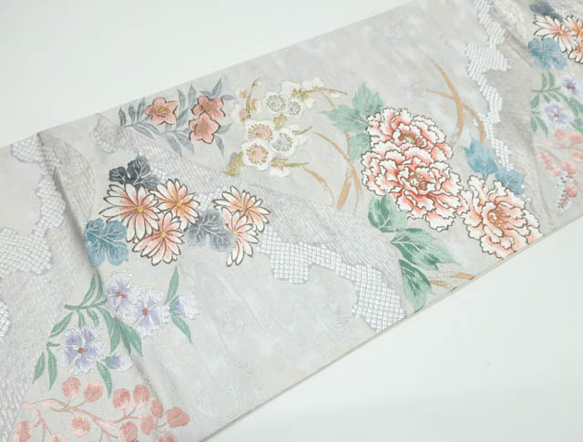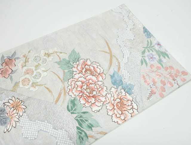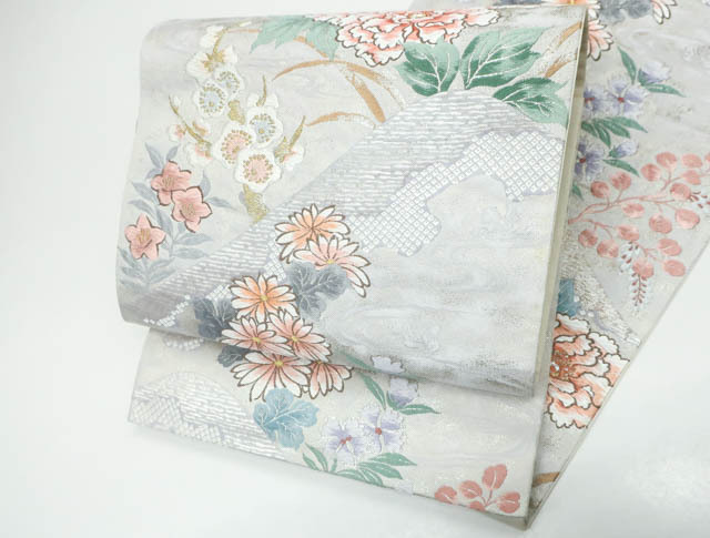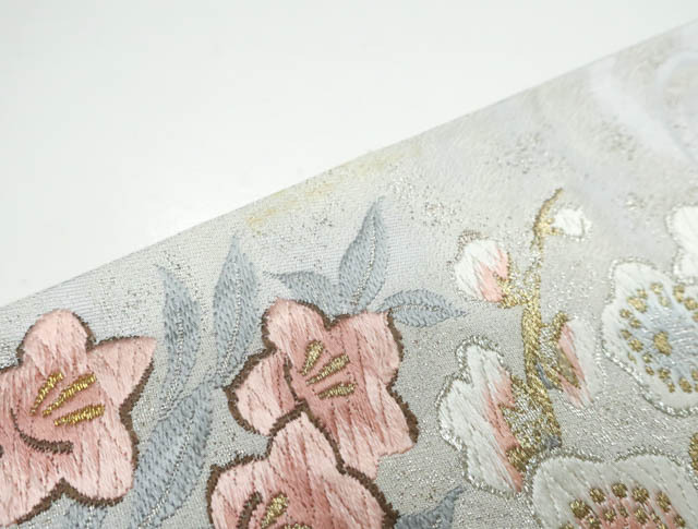 リサイクル商品の為、お太鼓上耳辺りや無地場折れ山に薄汚れがございます。 また、無地場 耳、裏にシミがございますがご着用いただけると存じます。 地色は、生成・銀です。 1枚目の画像が近いお色かと思われます。 素材は正絹です。 |
