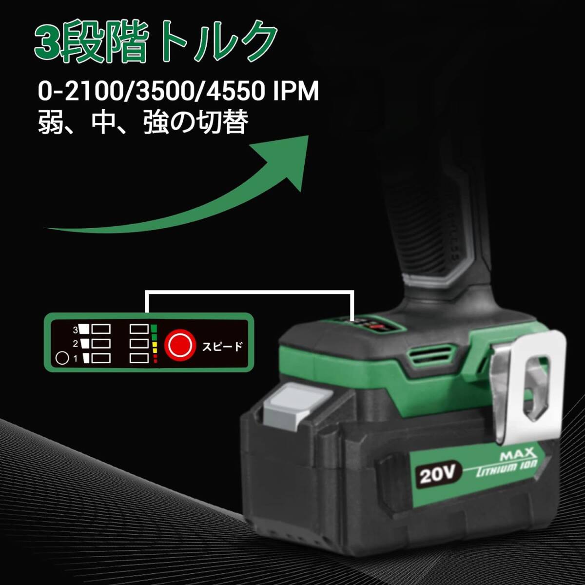 また、0-1500/2500/3250RPMと0-2100/3500/4550IPMの3段階トルク調整が可能です。弱、中、強の3段階に切り替えが可能で、過剰なトルクを出すことが少なく、作業がより精密に行えます。スピードが一定に保たれるため、細かい作業も可能になります。