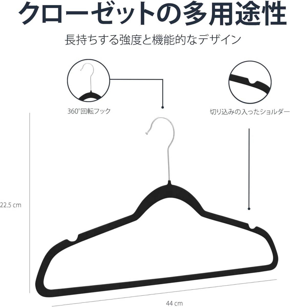 表面のベルベット素材と両肩部分のきりこみが衣類の落下を防ぎます。