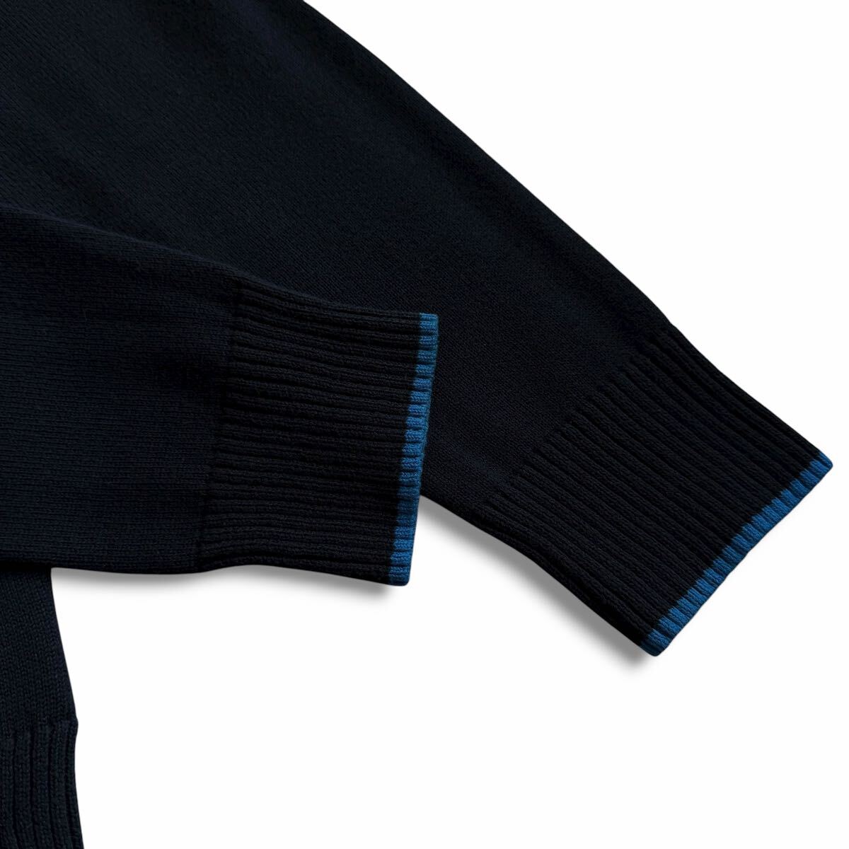 胸元にはホースロゴ刺繍を控えめに配置し、同系色のブルーがさりげなくアクセントに。フロントのボタンにもブランドロゴが刻印され、細部に至るまでブラックレーベルらしい高級感が宿っています。
