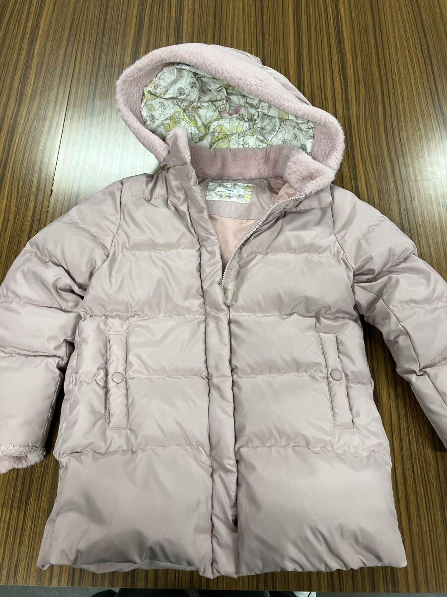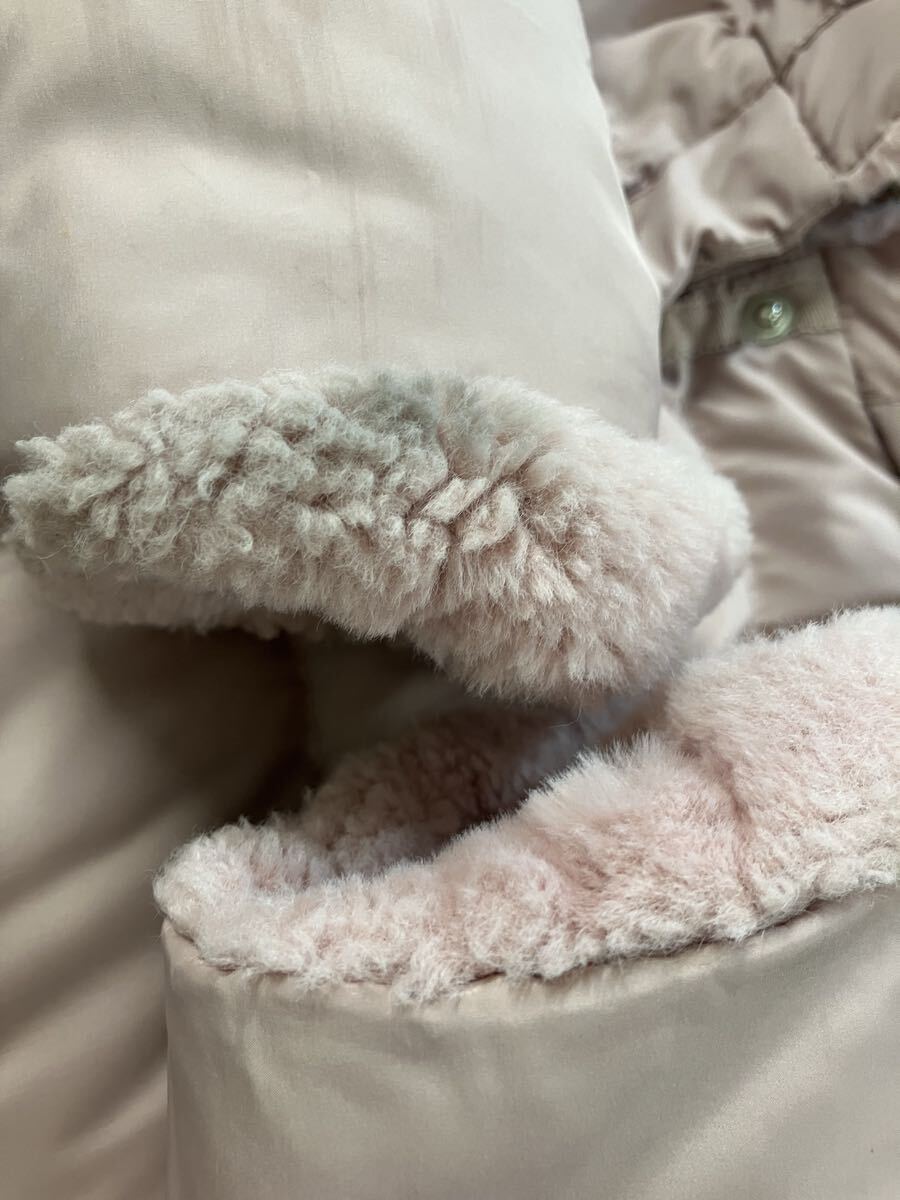 可愛らしいくすんだピンク色で、フードの内側がリバティ柄です。
