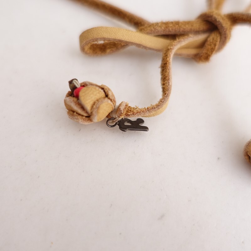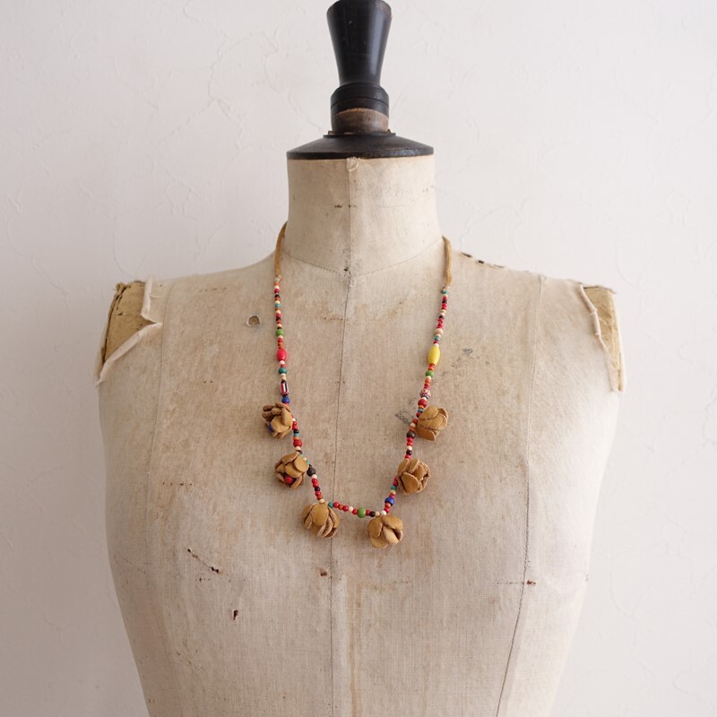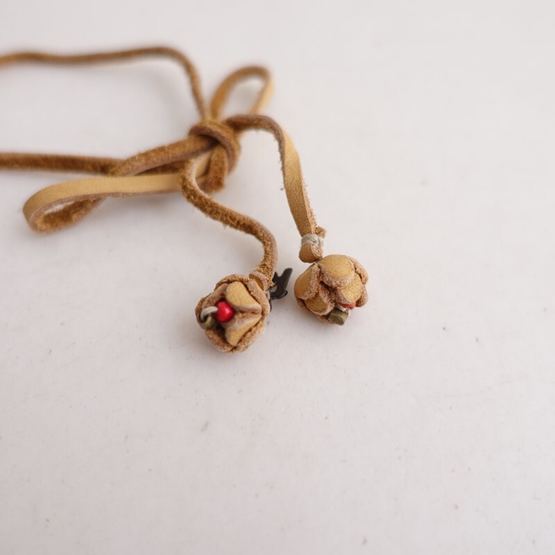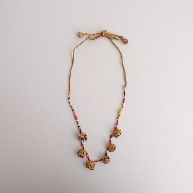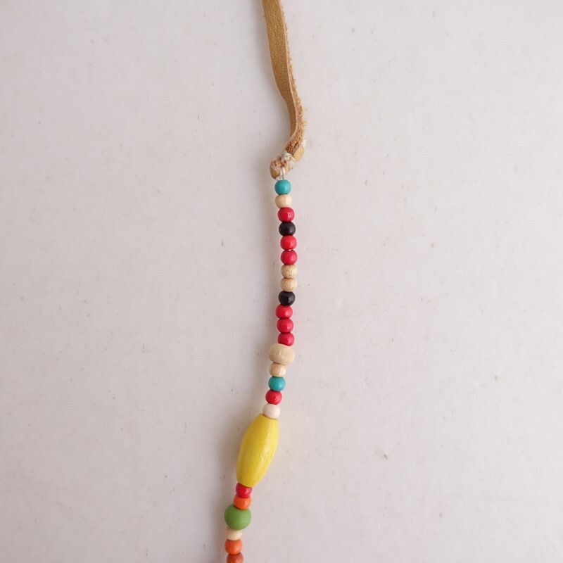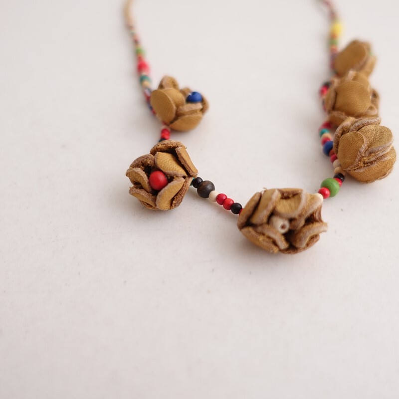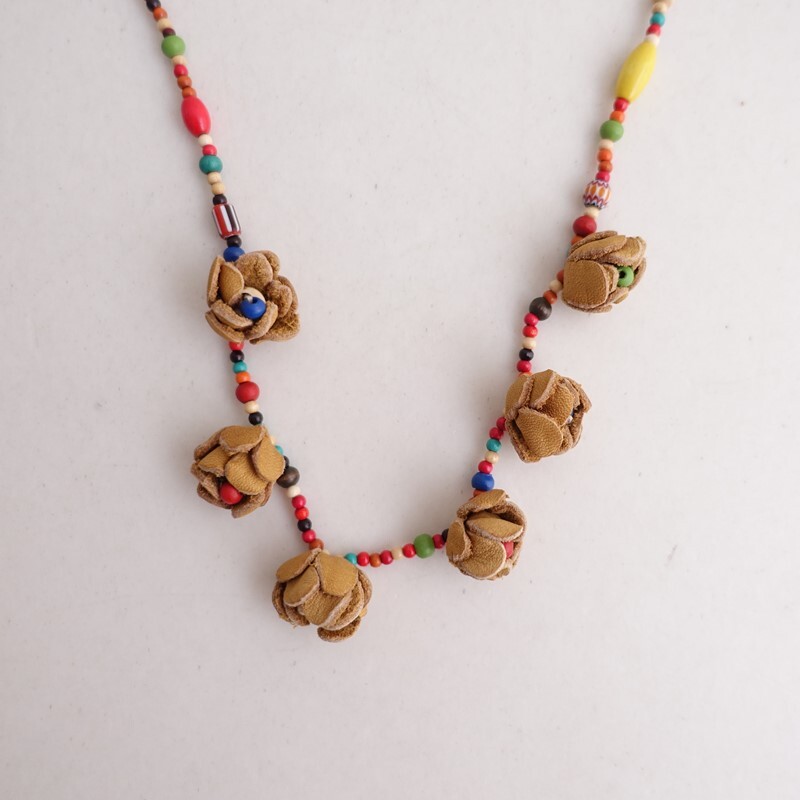 | 45Rのレザーフラワービーズのネックレスです。お花のかたちにくり抜いたライトベージュのレザーと赤、黄、青などのさまざまなビーズを組み合わさったネックレスです。結んで長さ調節して着用していただけます。定価(メーカー希望小売価格)28,600円のお品物です。 |