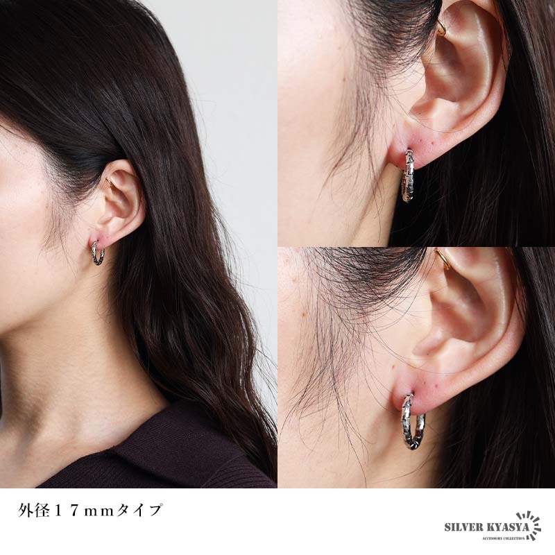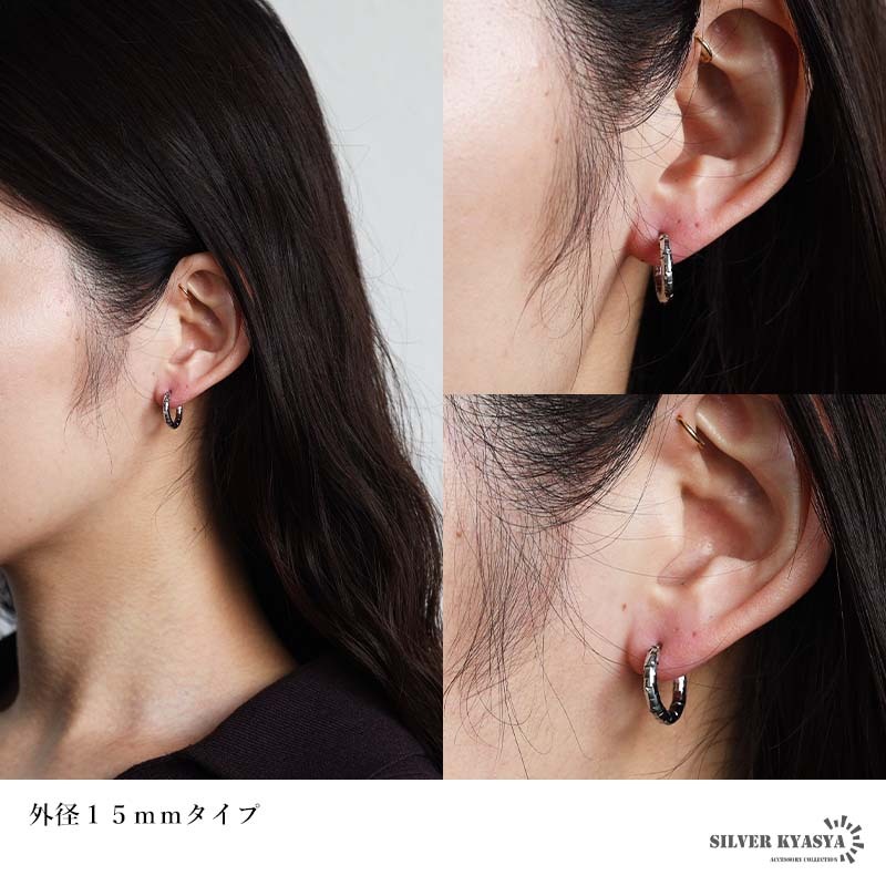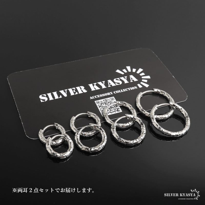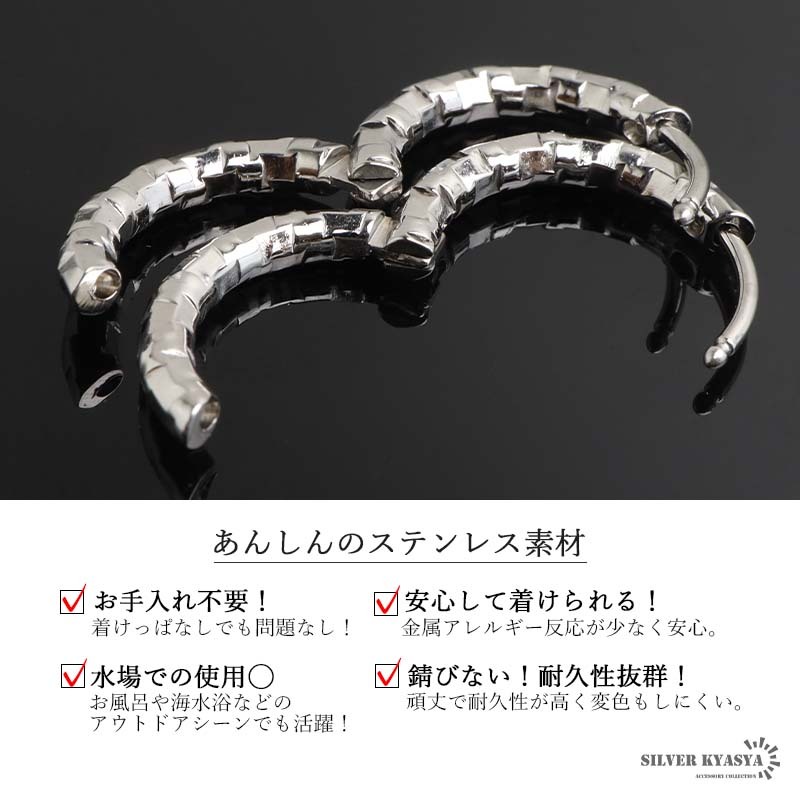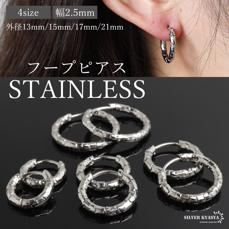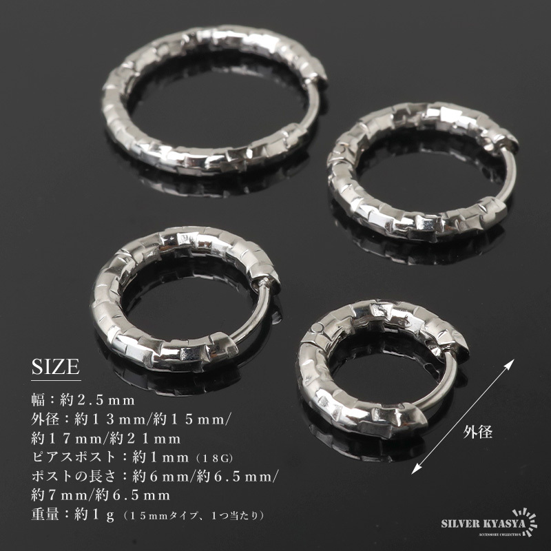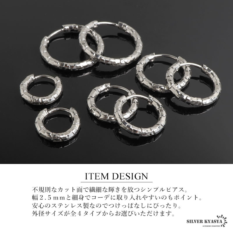 不規則なカット面で繊細な輝きを放つシンプルピアス。幅2.5mmと細身でコーデに取り入れやすいのもポイント。安心のステンレス製なのでつけっぱなしにぴったり。外径サイズが全4タイプからお選びいただけます。