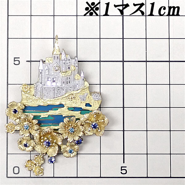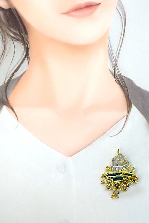 商品名石川暢子 ブルーサファイア ブローチ ダイヤモンド K18イエローゴールド Pt900 NOBUKO ISHIKAWA ペンダントトップ 2way 作家 デザイナー 風景 湖畔 城 花 フラワー 植物 ボタニカル エナメル ツヤ消し 梨地