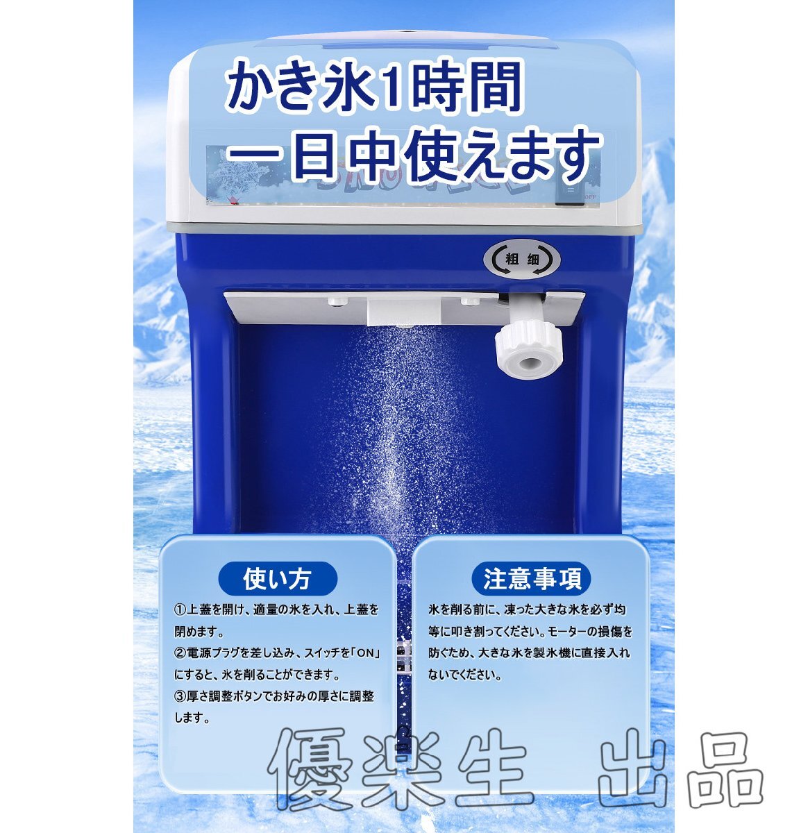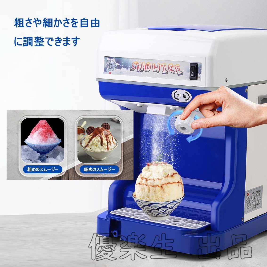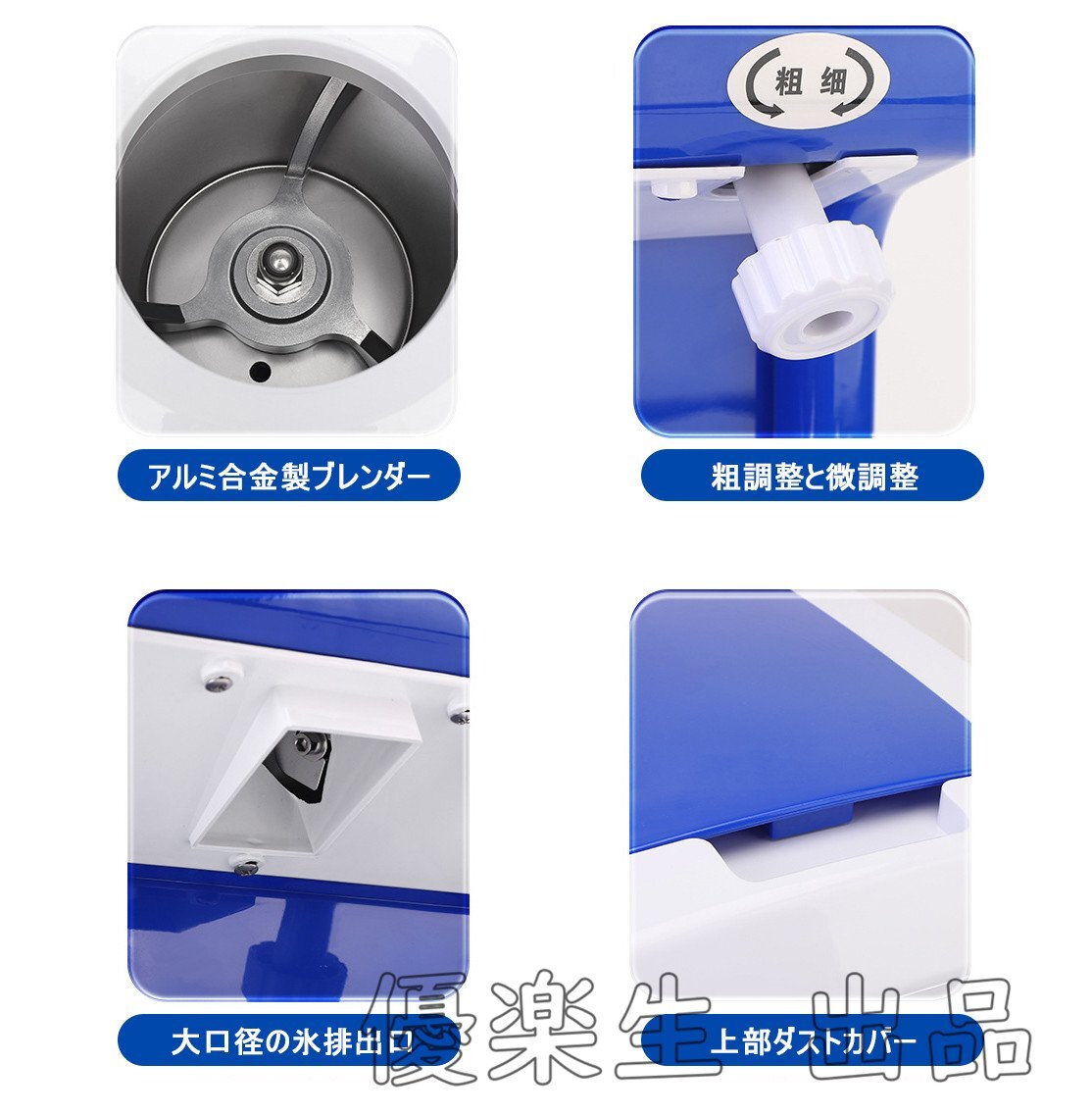 【特徴】:省エネルギー。高品質鋼製ブレード、よりシャープで耐久性が優れています。250W強力で高速なモーター、320prm回転速度、純銅被覆線、耐高温、より高効率に砕いた氷を作ります。