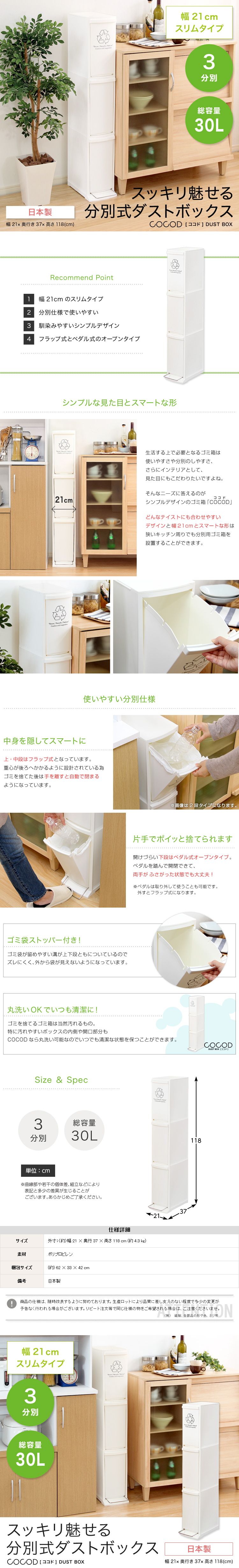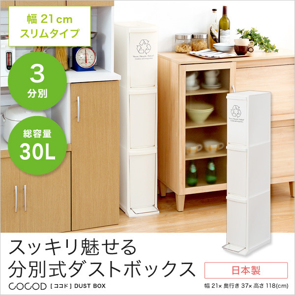 【ポイント】 フラップ式とペダル式のオープンタイプのダストボックスです。 分別仕様で使いやすく、幅21cmのスリムでシンプルなデザインです。 安心の日本製!カラーは清潔感のあるホワイトです。 |