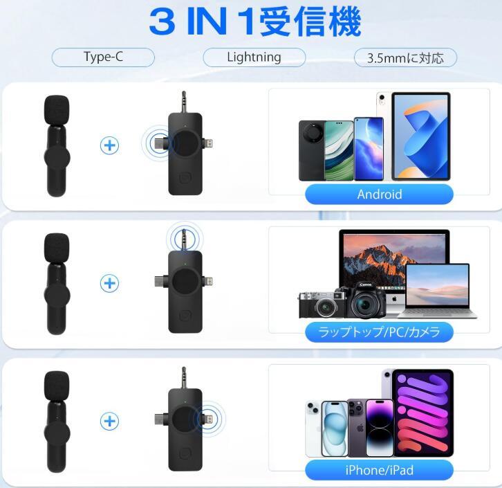 ピンマイク マイク 360°収音 瞬時接続 スマホマイク プラグ&プレイ ノイズ軽減 99% 3in1受信端