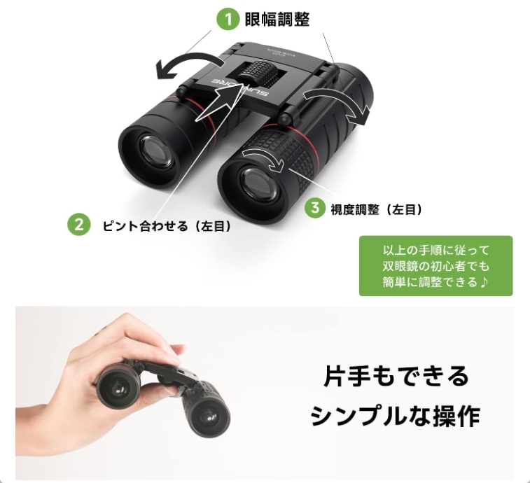 • 【初心者も、簡単な操作】日本語取扱説明書が付きます。また目当てリンクの調整を省いた構造なので、たった3歩だけで双眼鏡を素早く調節できます。お子様や初めて使う方も心配が少なく双眼鏡を楽しむことできます。1回調節が完了する次回はピントを調節するだけで目標物を変えてラクです。