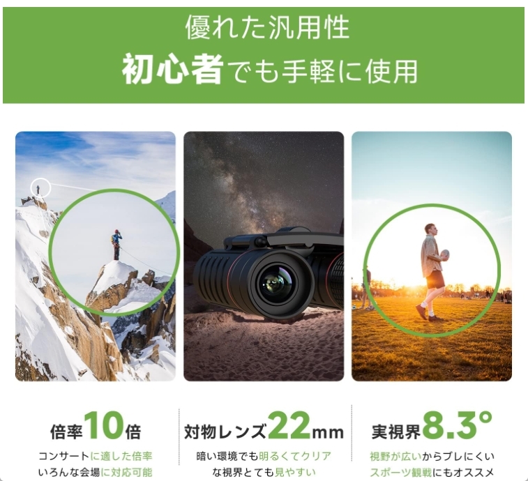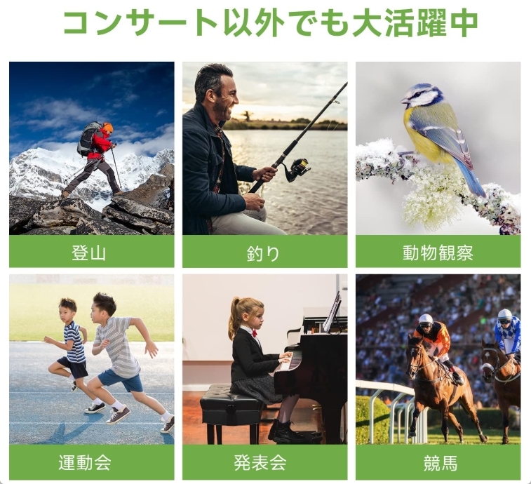 • 【10X22 HD双眼鏡】10倍倍率、22mm対物レンズと広い視野を備えたこの強力な双眼鏡は、バードウォッチング/コンサート/スポーツ/ハイキング/ハンティングなどの様々なイベントに最適です。倍率は10倍で、ライブ会場が屋内・屋外問わず使いやすいモデルです。本体形状はホールドしやすいように設計され、ブレの少ない操作が可能。またレインプルーフ設計なので急に雪や小雨が降る時にも安心!