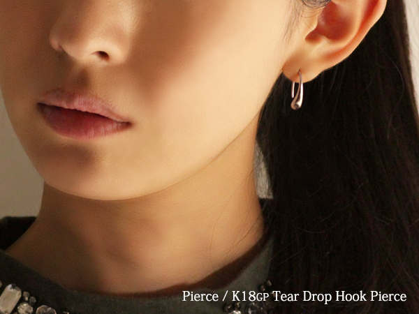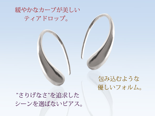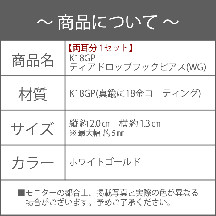 新品/ピアス/K18GP/ドロップ/フック/レディース/シルバー/18金/ホワイトゴールド/両耳/シンプル/しずく/雫/ティア/涙/メタル/WG
