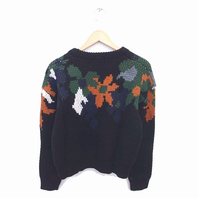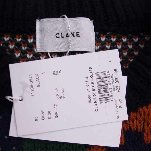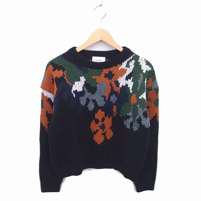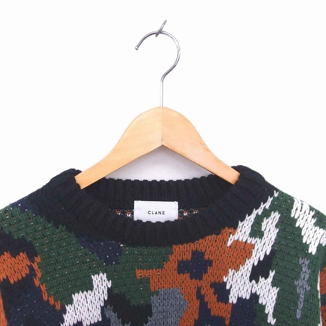 未使用品 クラネ CLANE タグ付き ニット セーター 丸首 総柄 ウール混 長袖 1 ブラック グリーン 黒 緑 /TT レディース