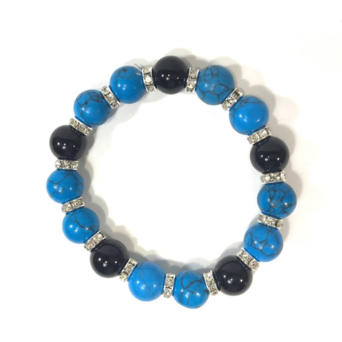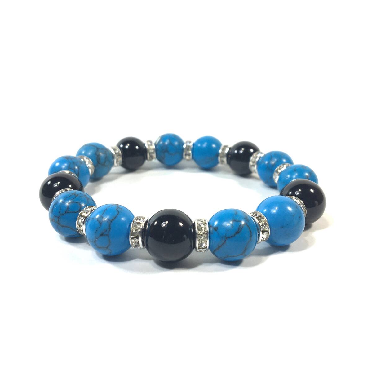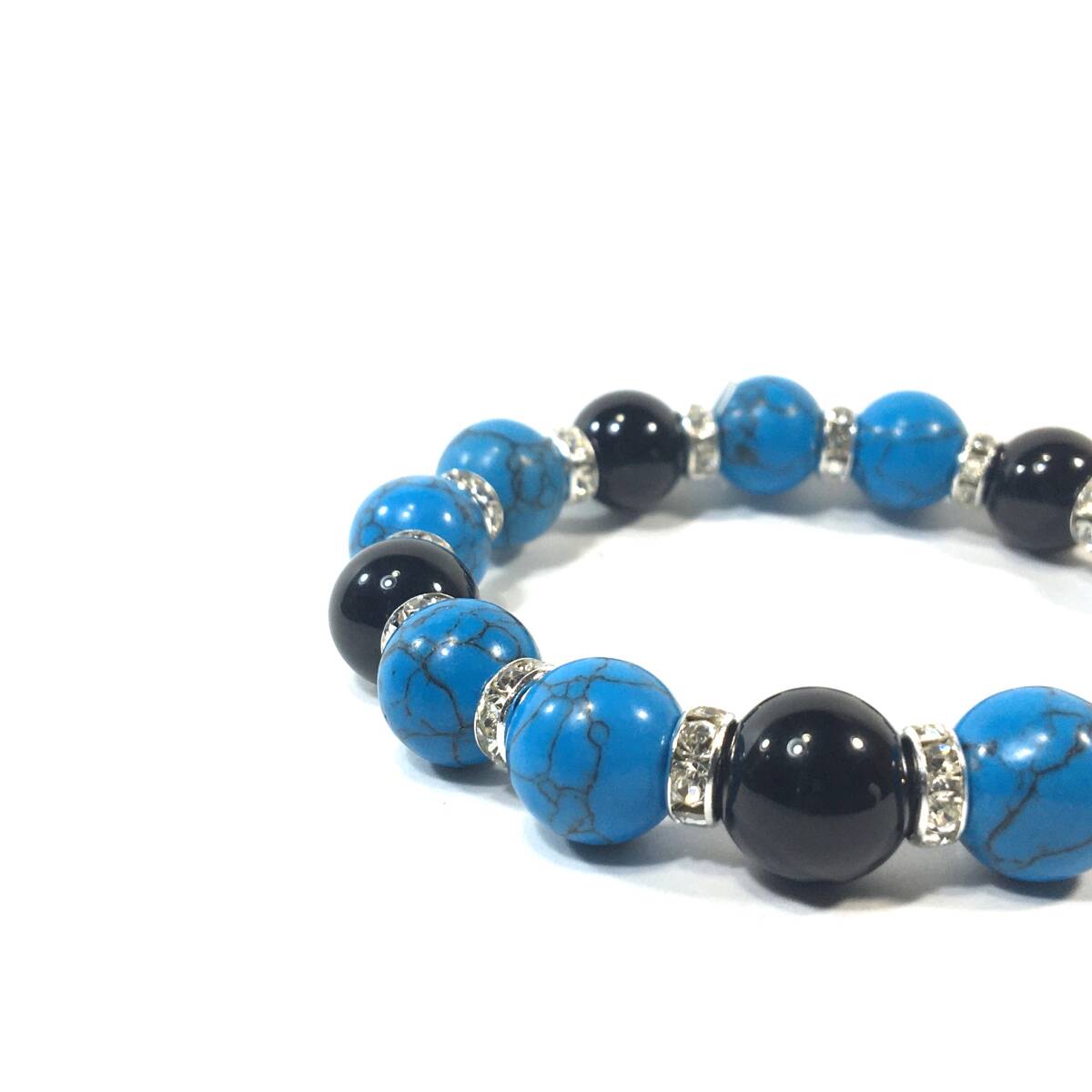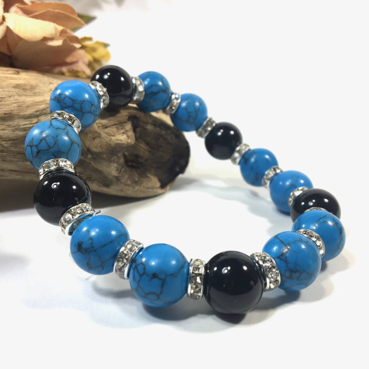 こちらは、ターコイズとオニキスを組み合わせたパワーストーンブレスレットです。間にはロンデルを挟み高級感あるデザインに仕上げております。石大きさは12mm玉を使用して内径約18cmです。気になる方は是非この機会にどうぞ。