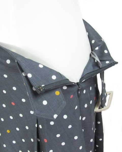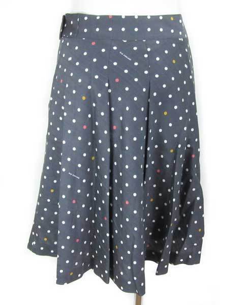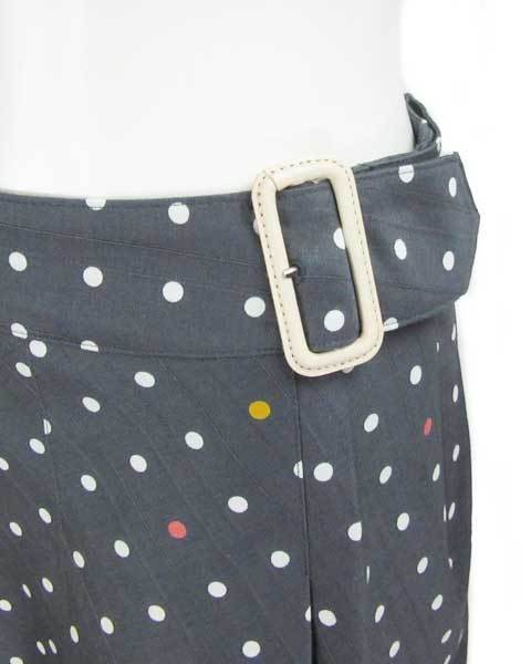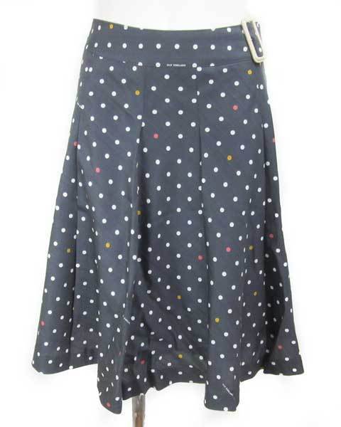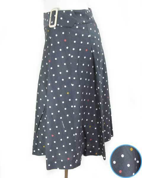 | タックでふんわり広がる女性らいいシルエットのスカート。ウエストバックルがポイントです。調節はできません。サイドジップタイプです。ドット柄に混じり、さり気なくブランドアピールがあります。 |