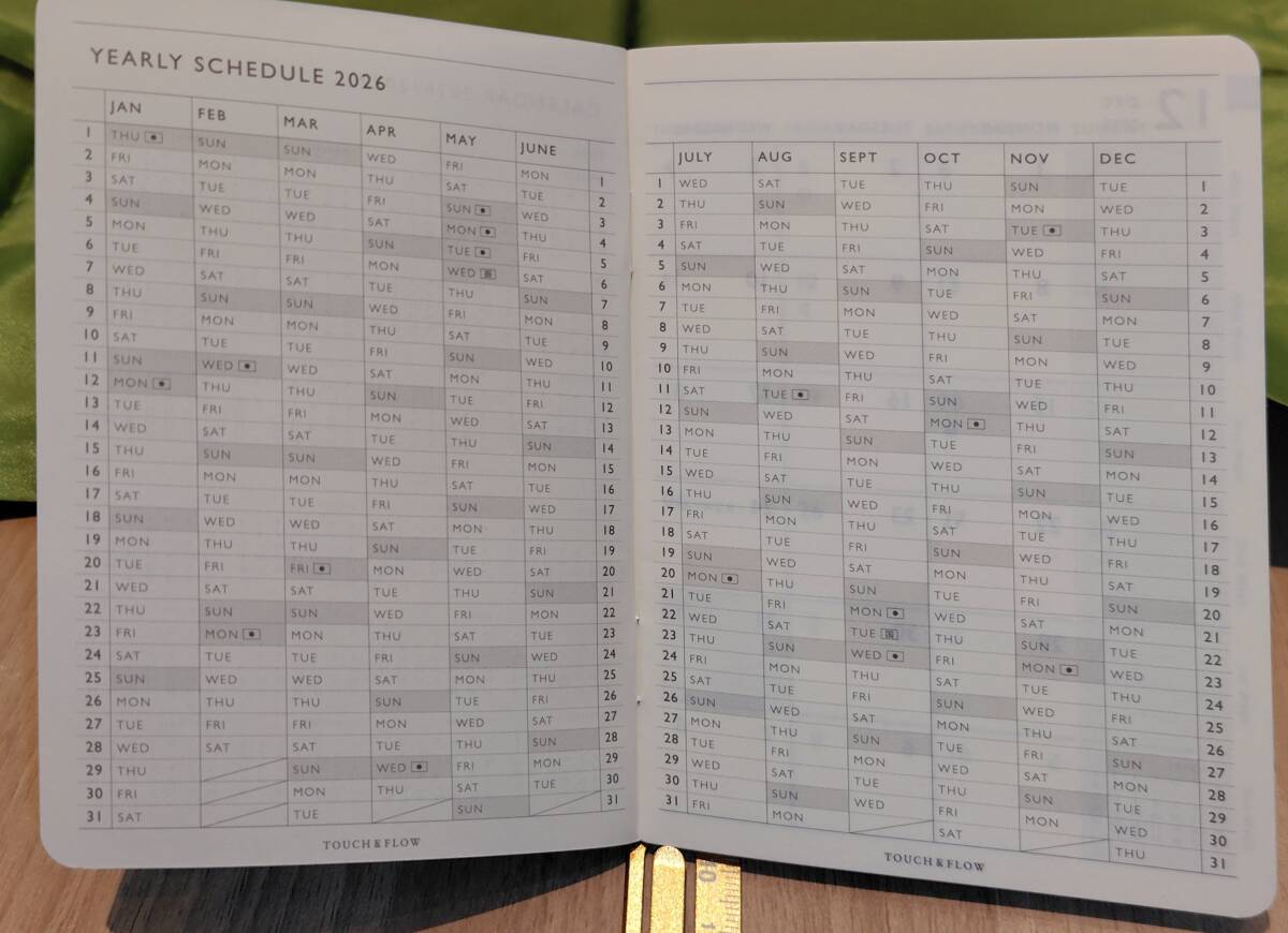 - 32ページ、月間ブロック(2025年12月~2026年12月)、年間カレンダー、年間スケジュール、アドレスリスト