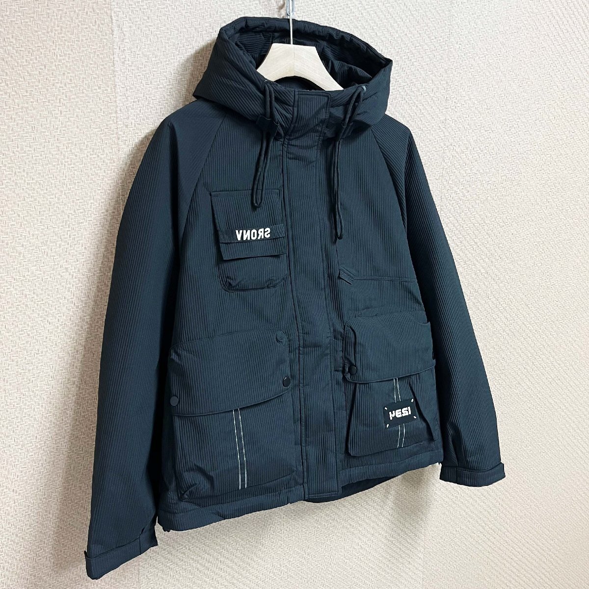大人に似合うシックな色味でどんな合わせ方でも馴染みやすい。胸元には個性的な英字柄のデザインが、オシャレ感をグッとアップさせます。コートと一体化のフード付き、ドローコードを締めれば、さらに風や寒さを防ぐことができます。ファスナーを上まで閉めれば、首元までマフラーいらずの暖かさ抜群。 両サイドと内側にはポケットを装備し、多機能で使い勝手も抜群。また、袖口はマジックテープの仕様で、裾部分はドローコード付き、さっと手軽にフィット感をカスタマイズ。