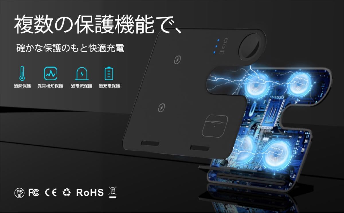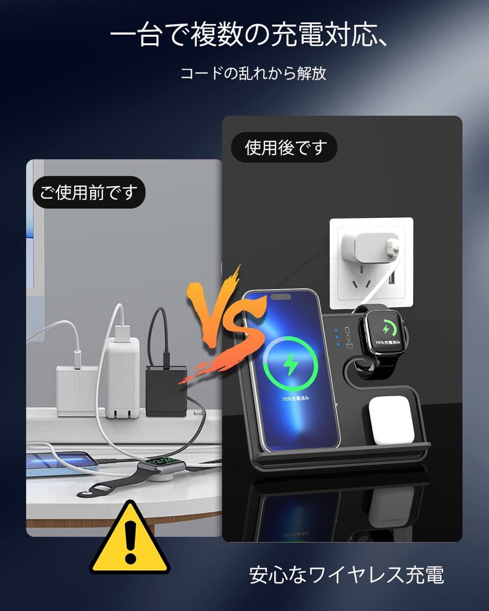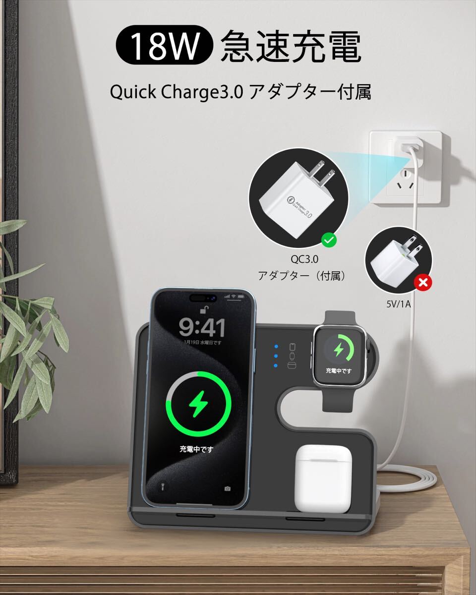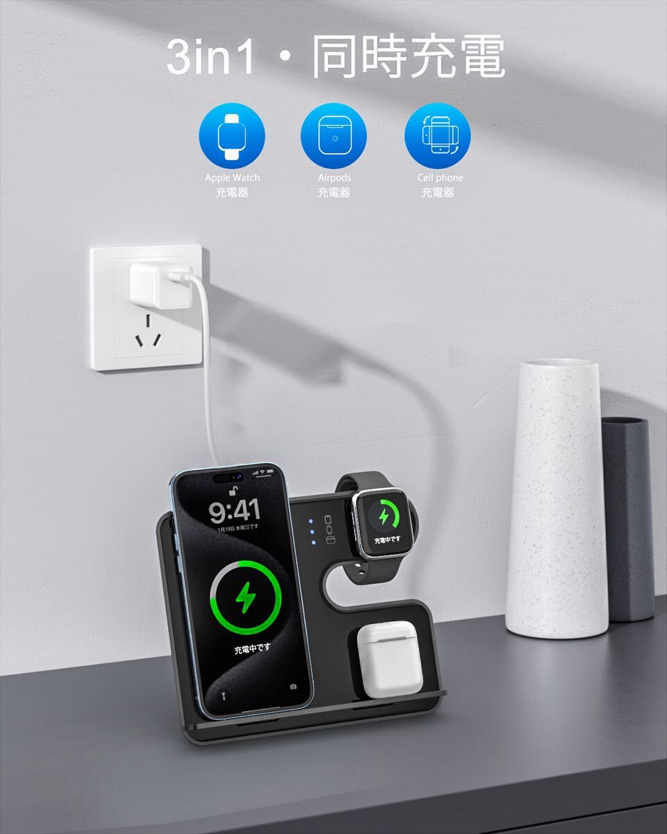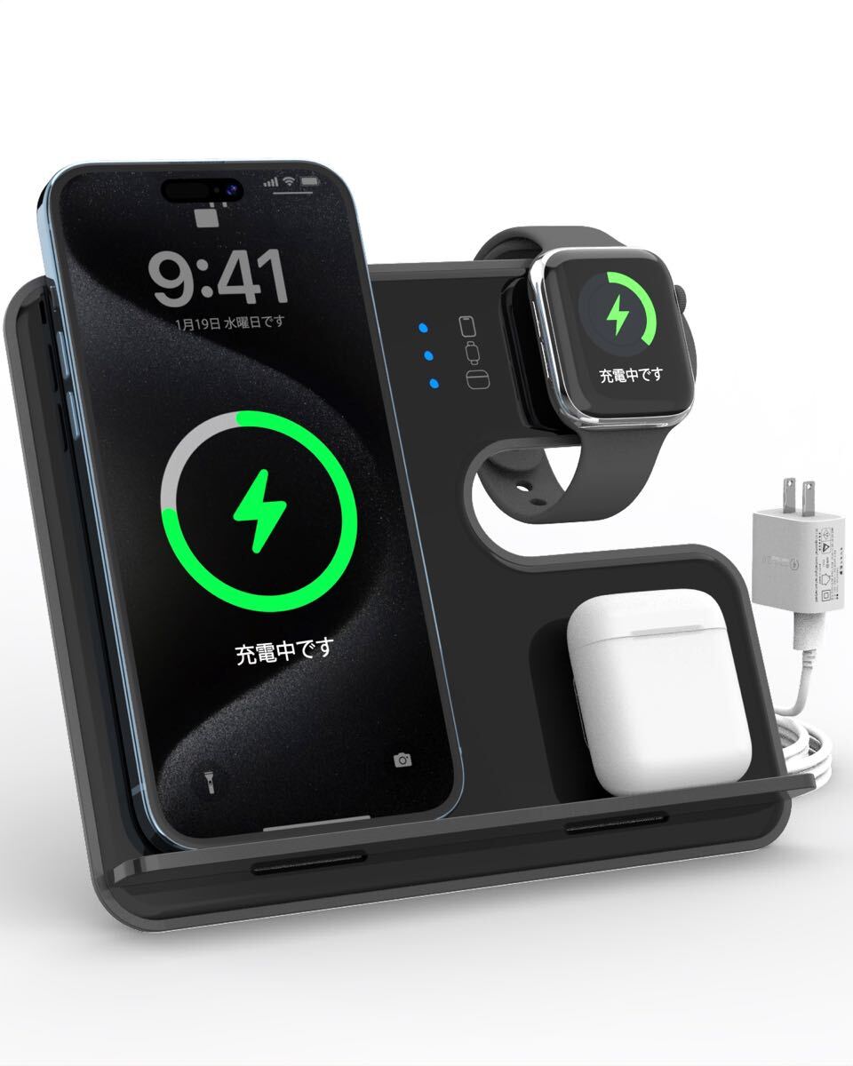 【全新設計】 ワイヤレス充電器 3in1充電器 スタンド充電器 アップルウォッチ充電器 折りたたみ式 マグネット式 急速充電スタンド テレワーク用品 新生活アイテム 置くだけ充電 お中元 夏のギフト ブラックPSE認証済み