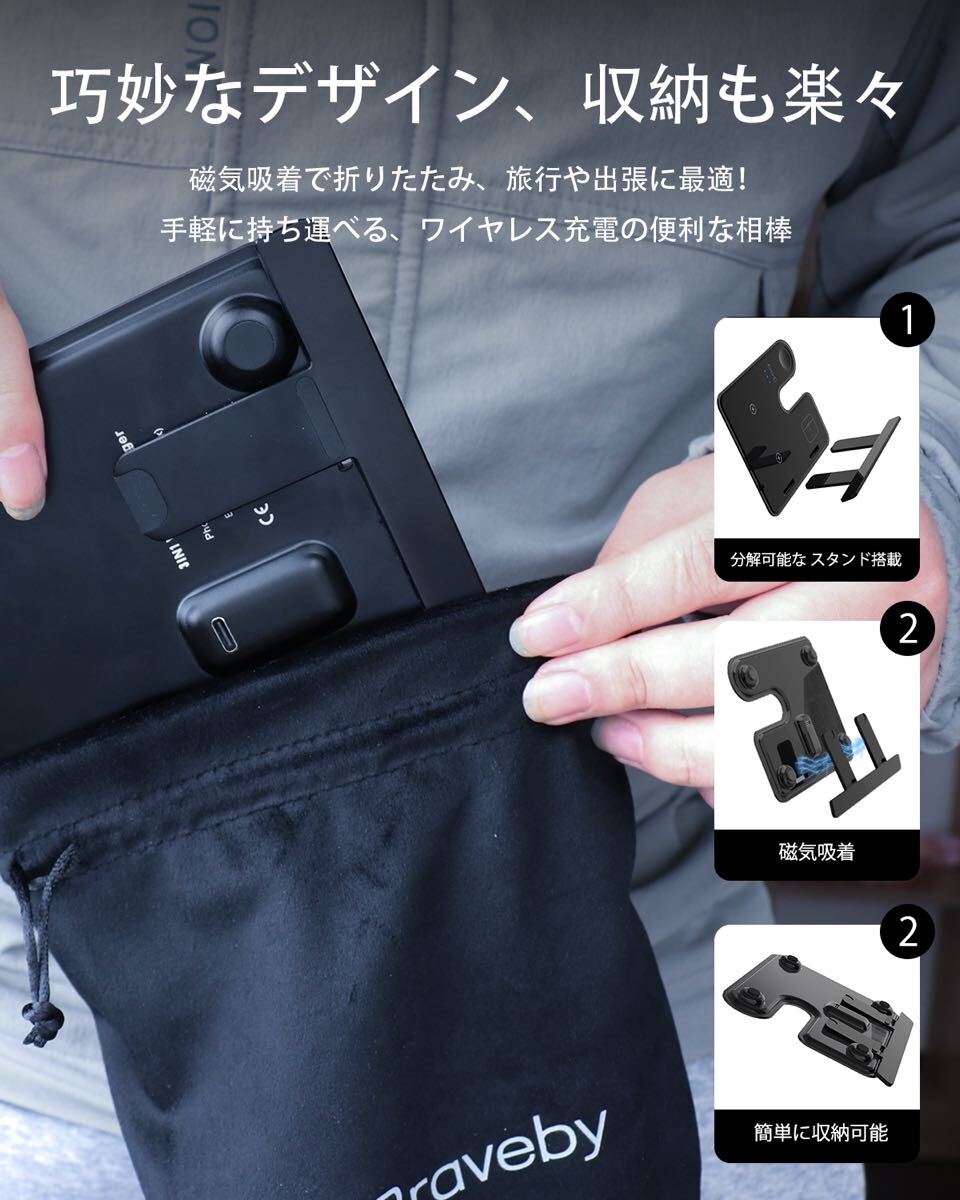 【携帯便利】本製品は非常にコンパクトで、バッグやポケットに簡単に収まります。旅行や出張時に場所を取らず、どこにでも持ち運びが可能です。Bravebyのワイヤレス充電器は、市場で唯一無二の全く新しい設計を採用しています。充電後は簡単に取り外して収納することができます。また、磁気吸着収納機能により、スタンドをしっかりと固定して収納できるため、持ち運びや保管時に安心です。