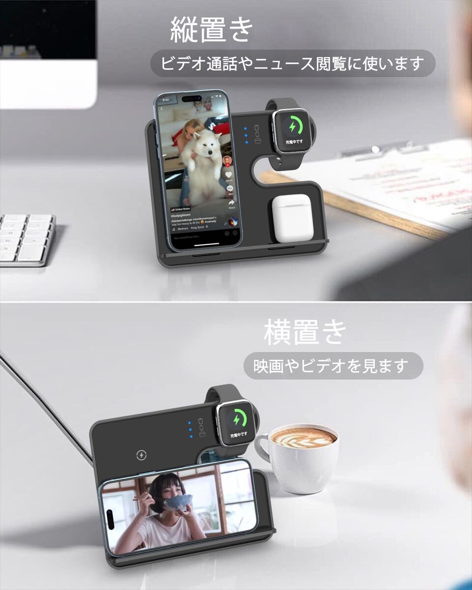 【幅広い交換性】iPhone 16/15/14/13/12シリーズ、iWatch Ultra2/Ultra/SE/9/8/7/6/5/4、AirPods 3/Pro2/Pro、他のQI機能搭載のワイヤレスイヤホン。スマホケースを付けたままでも充電することができます。従来の充電器と異なり、ケースを取り外す手間がありません。この便利な機能により、ユーザーはケースをつけたままでデバイスを充電でき、使用の煩わしさが大幅に減ります。(※8mm以下の厚みの場合に限ります。)