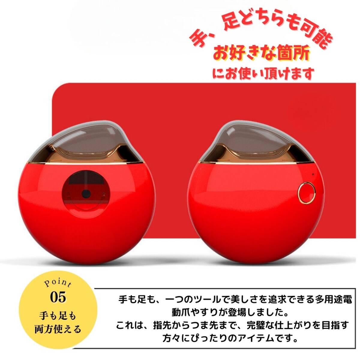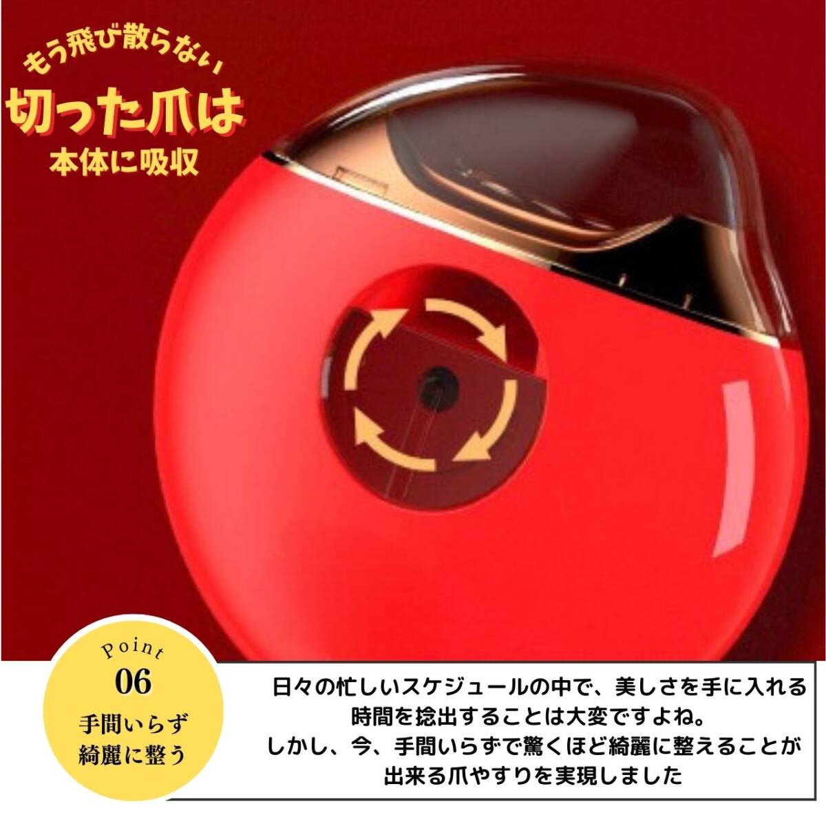指先からの華やかな輝き。エレガントなデザインで持ち運びが簡単。あなたの美を磨く電動爪やすり【使用方法】1.フロントカバーを開く2.電源スイッチを押す※2段階のスピード調節ができます。電源スイッチ★1回押し:お子さまに適した速さで回転し★2回押し:大人に適した速さで回転します。45度の角度で刃が回転して安全にけずれるようになってます。削れた爪のカスは飛散ることなく内部のBOXに集められます。捨てる際も楽々お掃除!静音で削る際の音が気になりません!【USB充電】30分充電で毎回6~10分で計算して約60回 MAX充電で約2か月くらい使用できます。【サイズ】約78x80x厚さ33mm*サイズは多少の誤差があるかもしれません。【重量】約95g【カラー】タイトル、商品画像1枚目をご確認ください。ご注意:PC環境により写真の色味など若干実物とイメージと異なることがあります。【注意事項】・海外製品のため多少の傷や汚れ等ある場合がございます。・送料の都合上箱なし、簡易包装での発送となります。コメントなしでの即購入OKです。おまとめ買いでお値引きさせていただきます。お気軽にコメントください。電動爪切り 電動爪やすり 電動爪削り足 赤ちゃん 介護 つめやすり 高齢者 足爪 USB充電 ネイルアートネイルケア コンパクト 安全 父の日 敬老の日 母の日 プレゼント ギフト 指ホワイト ブラック レッド 白 黒 赤