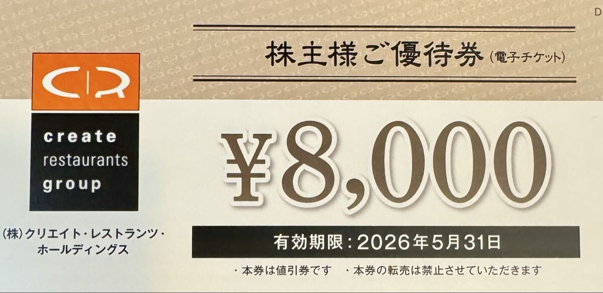 ■クリエイト・レストランツ・ホールディングスの株主様ご優待券32000円分(8000円券4枚)です。